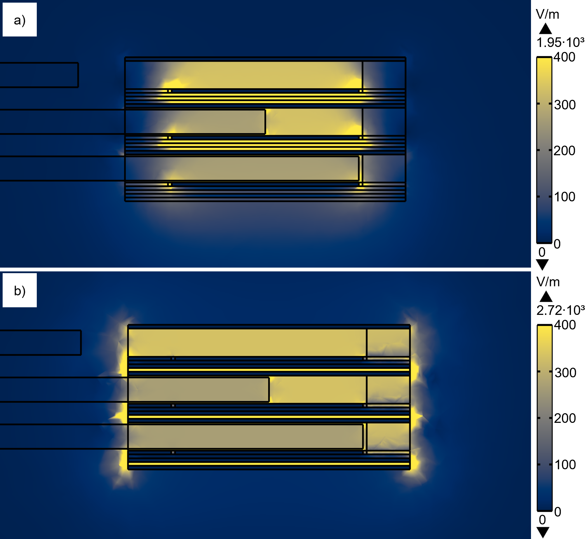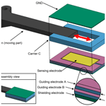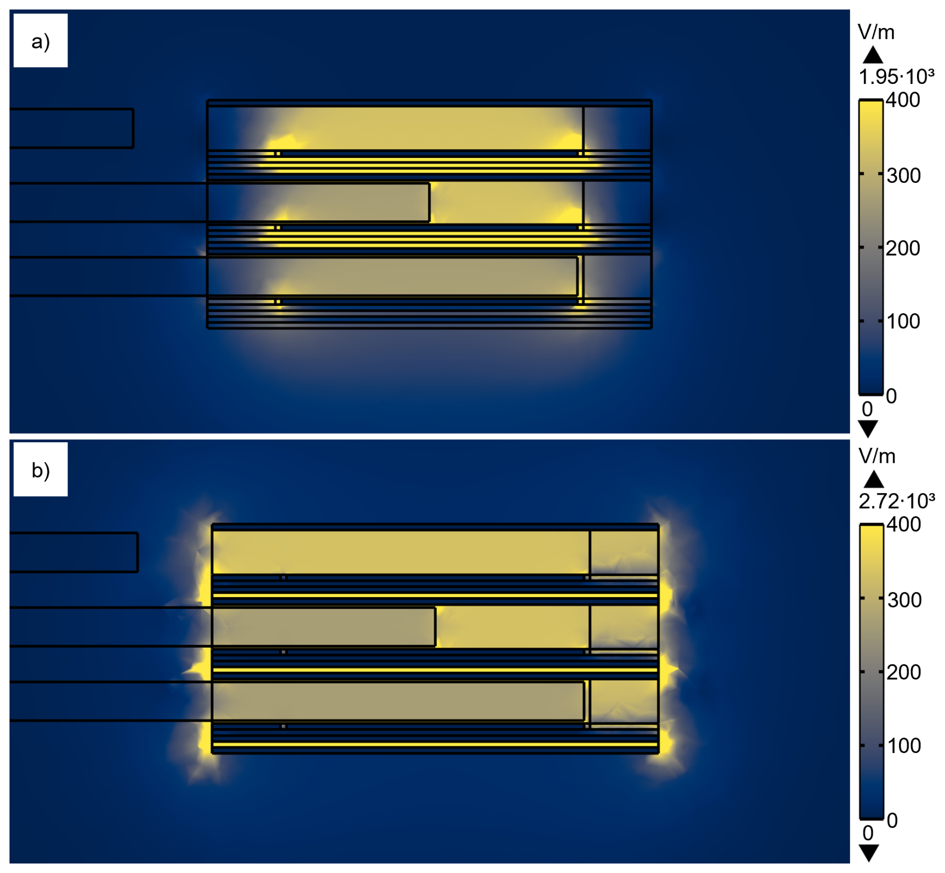 The effect of the guiding electrode arrangement is shown in Fig. 3. Compared to the sensor without connected guiding electrodes, the electric field of the sensing electrode is directed within the measuring range, and the influence of the edge effects is minimised by the arrangement of the guiding electrode around the sensing electrode, leaving only the side to the measuring range open. The electric field in the measurement area is more homogeneous. The grounded shielding electrodes serve to safeguard the sensor from external influences, also preventing mutual interference between the individual pin sensors. The design provides linearity, precision and accuracy.