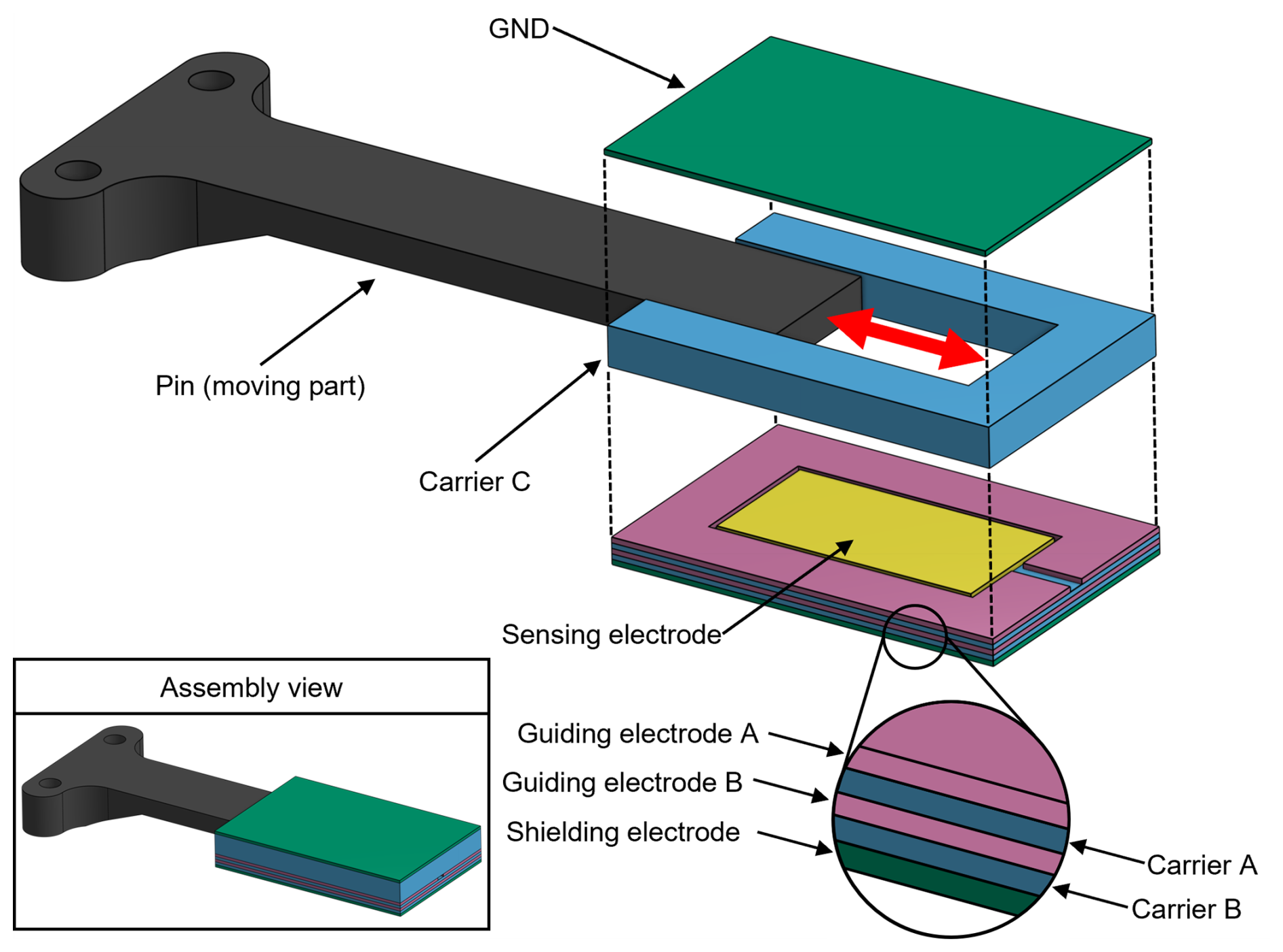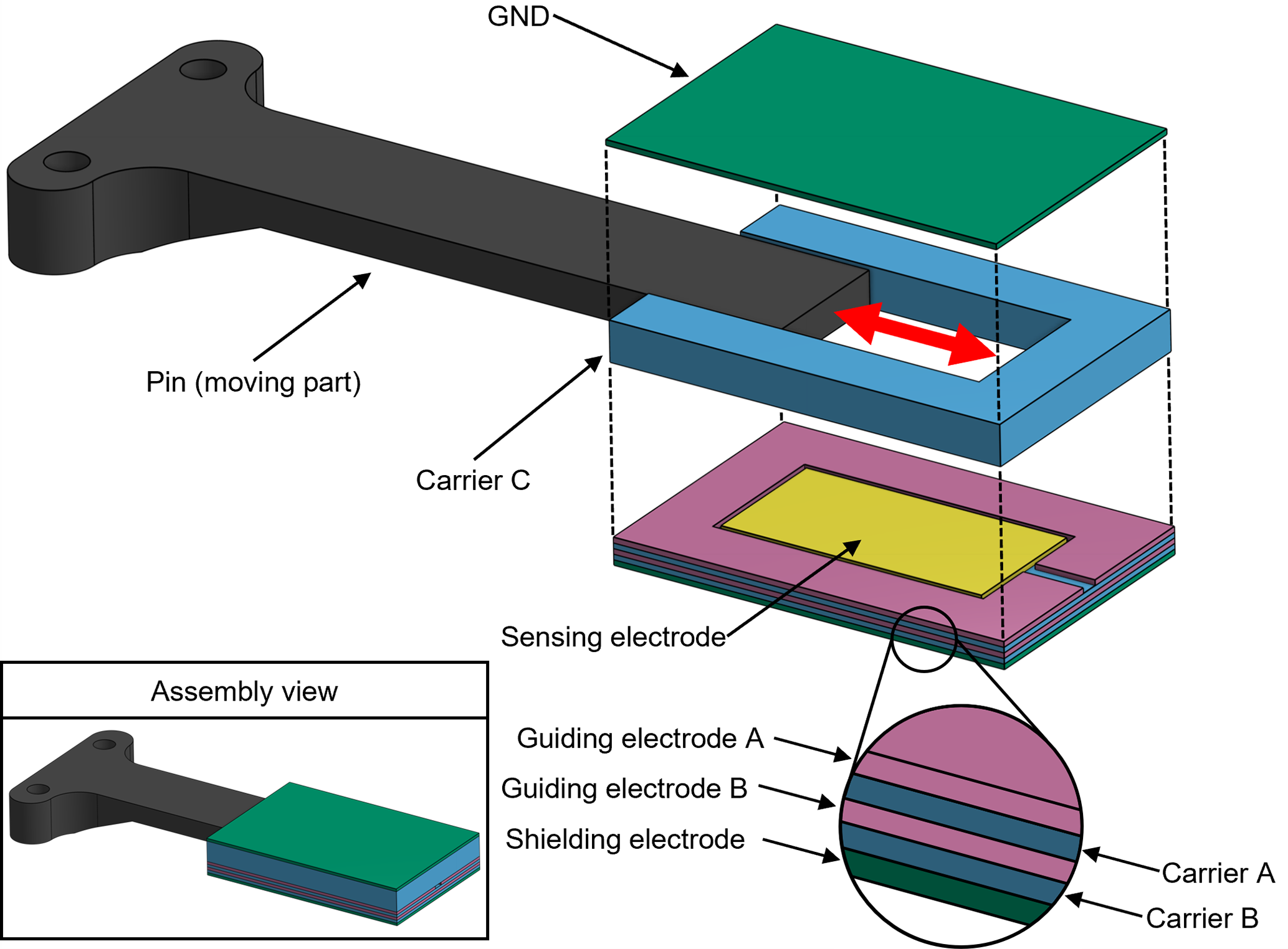 In Eq. (1), ε0 represents the permittivity of the vacuum space, εr is the relative permittivity of the dielectric material between the electrodes, d is the distance between the electrodes and A is the area of the sensing plate. Consequently, the capacitance of a parallel plate capacitor is affected by the geometry of the electrodes, the distance between the plates and the dielectric properties of the material. The change in dielectric properties is the basic working principle of the presented sensor design. The space between the plates consists of two different materials and can be thought of as two capacitors being electrically connected in parallel. The current location of the pin divides the two capacitors horizontally into one containing air (relative permittivity εAir) and the other containing the pin material (relative permittivity εPin). In addition, an air gap dGap must be regarded as capacitors connected in series. This provides the necessary mechanical freedom for the pin to move within the sensor. Moving the pin causes the total capacitance to change due to the changing partition of air and pin material. The areas of these regions are determined by the pin's position x, relative to the total length of the measurement range, where a higher x means that the pin is pulled farther out of the sensor. According to this, the total capacitance related to the pin position Ctotal(x) can be simplified as a linear equation and calculated by