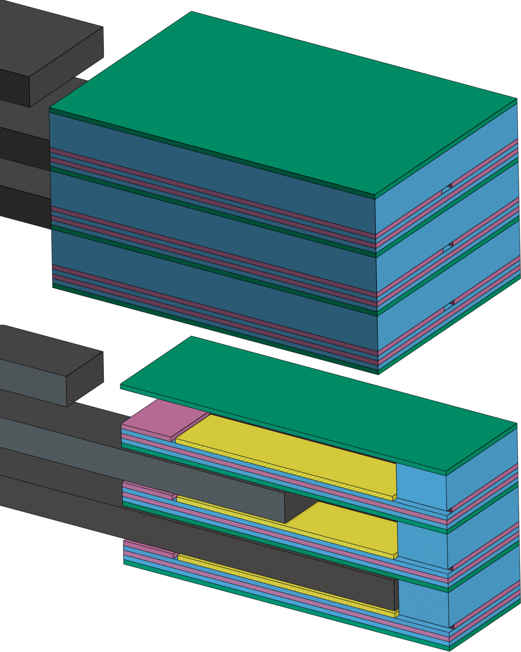 The concept builds on previous work, in which a capacitive level sensor was designed (Hangst et al., 2022). The sensor includes sensing, guiding and shielding electrodes. The shielding electrode located on the opposite side of a sensing electrode forms the parallel plate capacitor with it. The guiding electrodes have the same voltage potential as the sensor sensing electrode. The sensor electrode concept for a pin gripper is shown in Fig. 1. It can be scaled by adding more electrodes according to the scheme as shown in Fig. 2 for three pins.