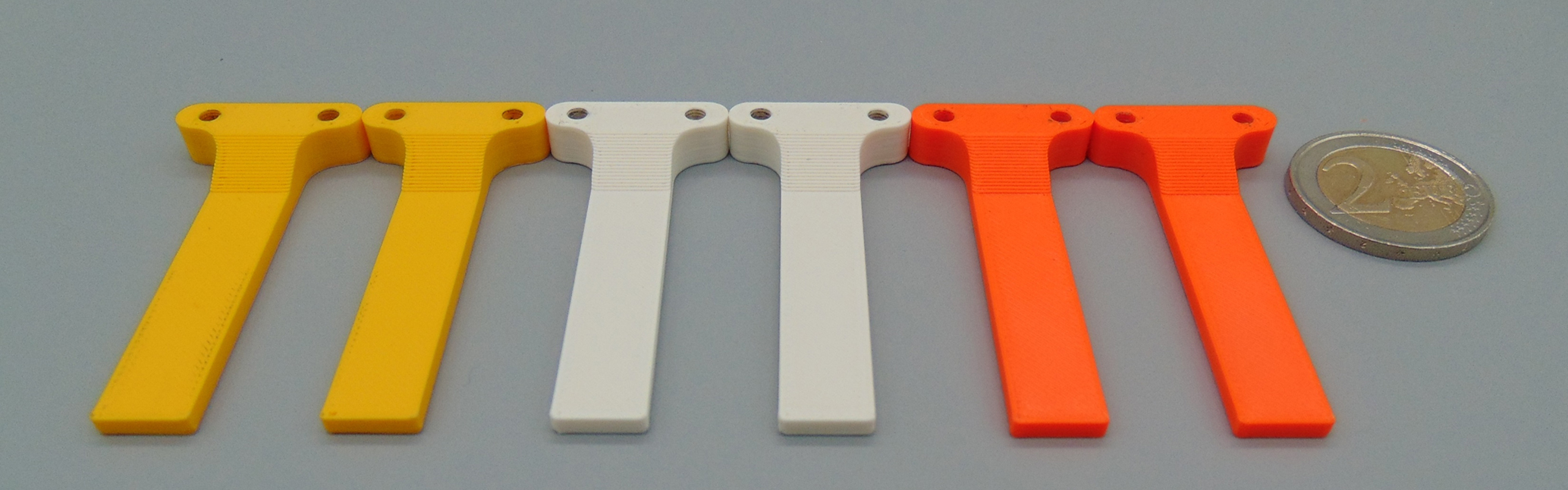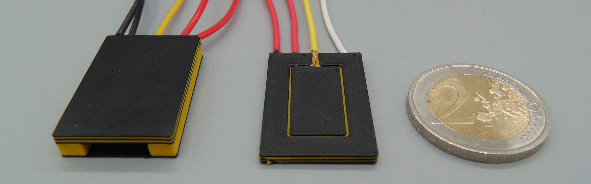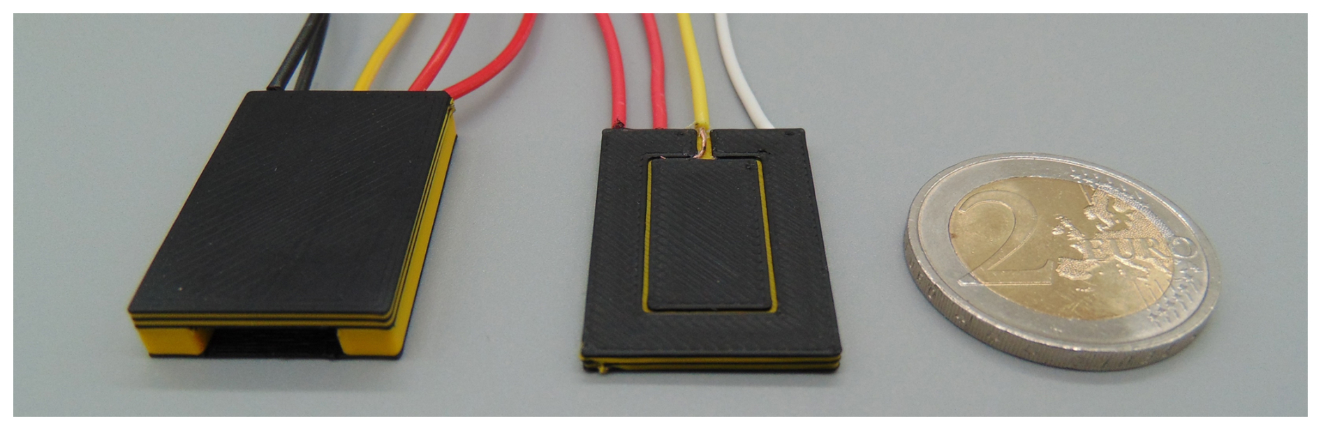A test sensor for one pin was designed for the purpose of establishing the concept's viability. The measuring range is 20 mm with a desired resolution of 1 mm. The geometric dimensions of the sensor are 20 mm in width, 30 mm in length and 5.4 mm in thickness. Each of the electrodes has a thickness of 0.4 mm. The sensor was manufactured using the 3-D printing system Neotech AMT 15X SA with a layer height of 0.2 mm and 100 % filling density. The 3-D printed sensor is made of PLA (ecoPLA, 3DJAKE) and conductive PLA from Protopasta. The conductive layers serve as electrodes. Copper wires are applied to integrate the electrodes into the evaluation circuit. The test sensor as complete and partially with the sensing side is shown in Fig. 4. The pins used for the measurements are made of PLA (ecoPLA, 3DJAKE), ABS-T (Filament PM) and ASA (Prusament ASA, Prusa Polymers) and were manufactured using a Prusa MK4S with a layer height of 0.2 mm and 100 % filling density. The dimensions of the pin are 10.4 mm in width and 2.6 mm in thickness. This results in a circumferential gap between the pin and the sensor of 0.2 mm. This provides the necessary mechanical freedom for the pin to move within the sensor, without a significant loss of capacitance change.