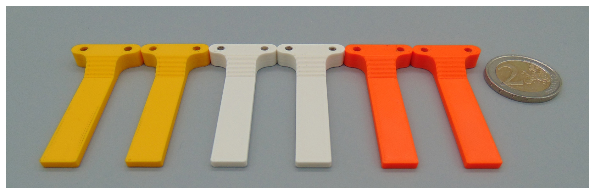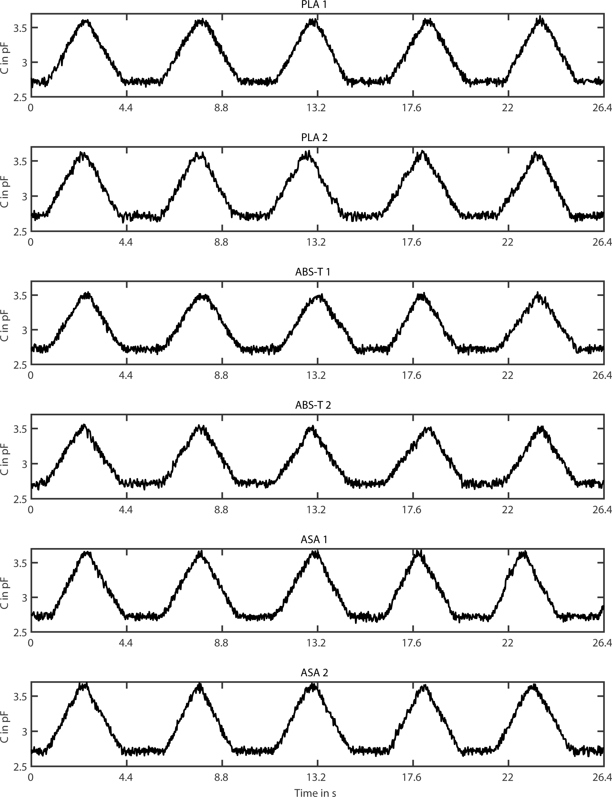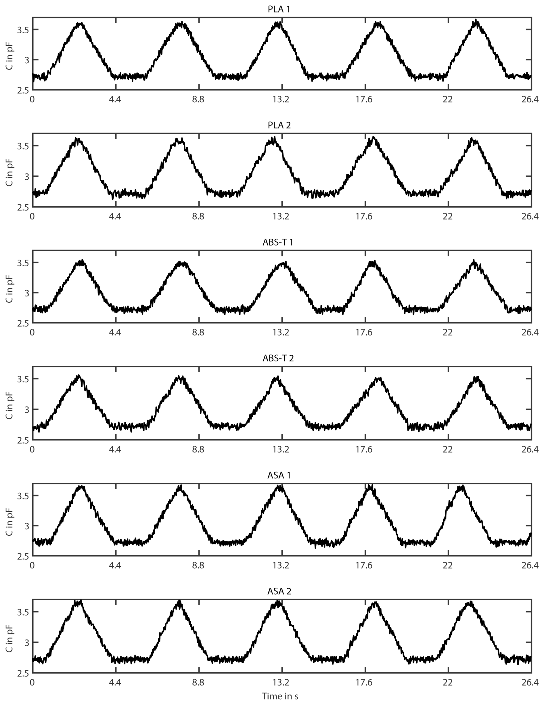 Figure 13 depicts the capacitance plotted over time for the six pin samples. All samples show periodic behaviour, indicating the expected repeating pattern in capacitance measurements. Five complete cycles can be seen, indicating stable and regular behaviour. The different materials (PLA, ABS-T and ASA) have similar responses under the conditions measured. The maximum peak is different across the individual materials, which is related to the differing εr of the materials. The amplitude remains constant over the entire series of measurements for one pin, which indicates a consistent physical behaviour of the samples. The lower inflection point is stable over all measurements but shows higher fluctuations than in the previous measurements. In general, the fluctuation is higher, which is due to the dynamic conditions, the higher sampling frequency, the accuracy and the deviation of the speed from the linear guide. Overall, the data indicate consistent behaviour of the samples under the given measurement conditions. The concept presented for 3-D printed capacitive displacement sensors opens up new design possibilities, enabling the development of fully additively manufactured pin grippers with integrated displacement sensors. These sensors can be easily scaled and adapted to a wide range of applications due to the simplified manufacturing process.