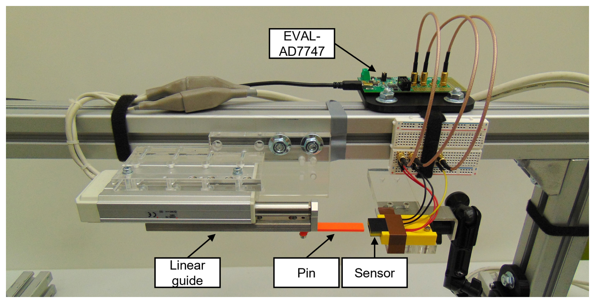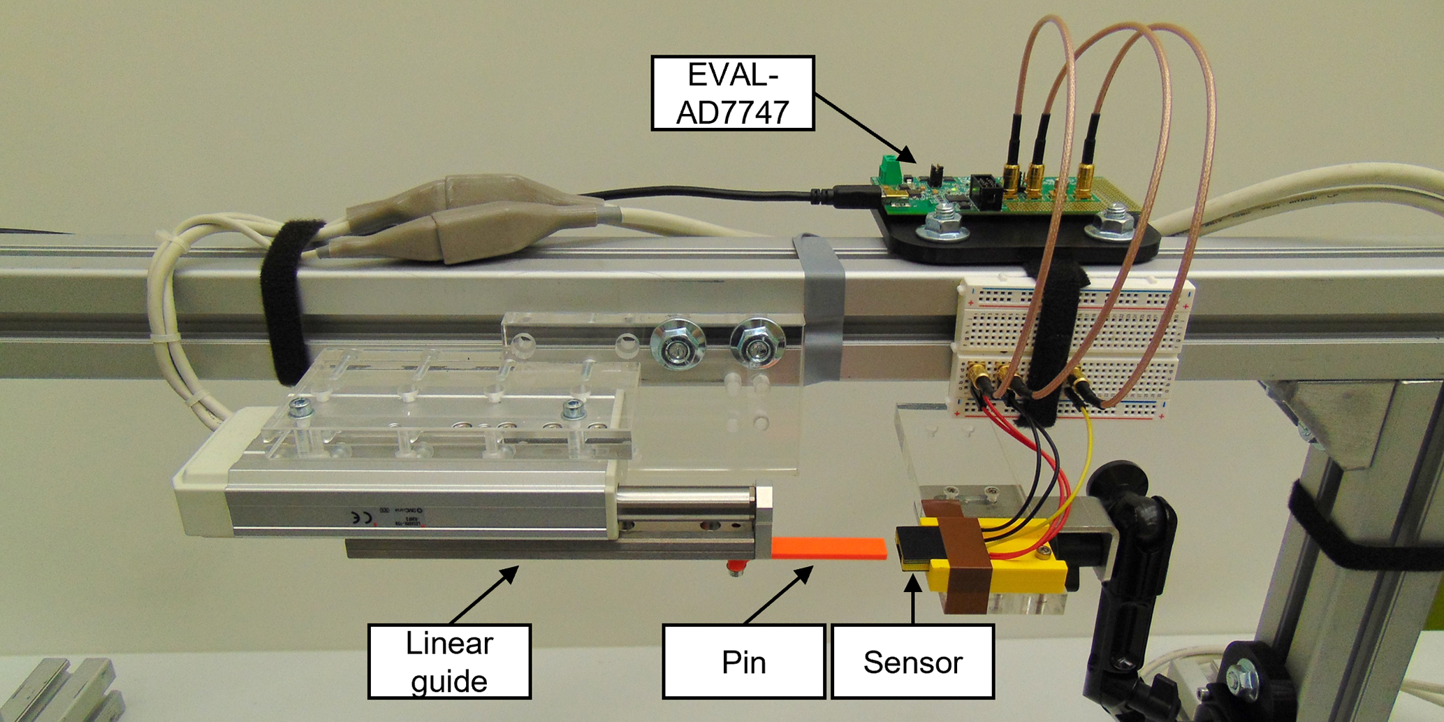 We tested the sensor in an experimental setup to verify the simulation results. The sensors were connected to a capacitance-to-digital converter (CDC), with measurements conducted using the EVAL-AD7747 board from the company Analog Devices. This board leverages the AD7747 CDC to achieve a resolution down to 20 aF and excellent linearity (±0.01 %) in capacitance measurements. The CDC is equipped with a port for active shielding, which is connected to the guiding electrodes (Devices, 2007). The excitation frequency used for the measurements is 16 kHz. A resistance in series with the measured capacitance affects the performance of the AD7747 CDC. This series resistance must be less than 10 kΩ to achieve the specified performance (Devices, 2007). A total of 1000 resistance measurements were conducted, with a Keithley 2450 SourceMeter. The measured average serial resistance of the sensing electrode is 851 Ω, with a standard deviation of 0.2 Ω. The evaluation board was connected to a PC where the data were collected and analysed in MATLAB. The measurements were carried out using two pins made of PLA, ABS-T and ASA, as shown in Fig. 5. The pin displacement is achieved with a linear guide (SMC LESH8RK-75B-R36P3), which moves the pin from 0 mm (pin is fully inserted) to 30 mm displacement (pin is 5 mm away from the sensor opening). The measurements were carried out in two different ways. First, the linear guide moves in 1 mm steps, and 100 measurements are taken for the capacitance for each step, with a sampling frequency of 8.1 Hz. Second, the linear guide moves back and forth with a constant speed of 10 mm s−1, and 1200 measurements are taken over time, with a sampling frequency of 45.5 Hz. Figure 6 shows the measurement setup.