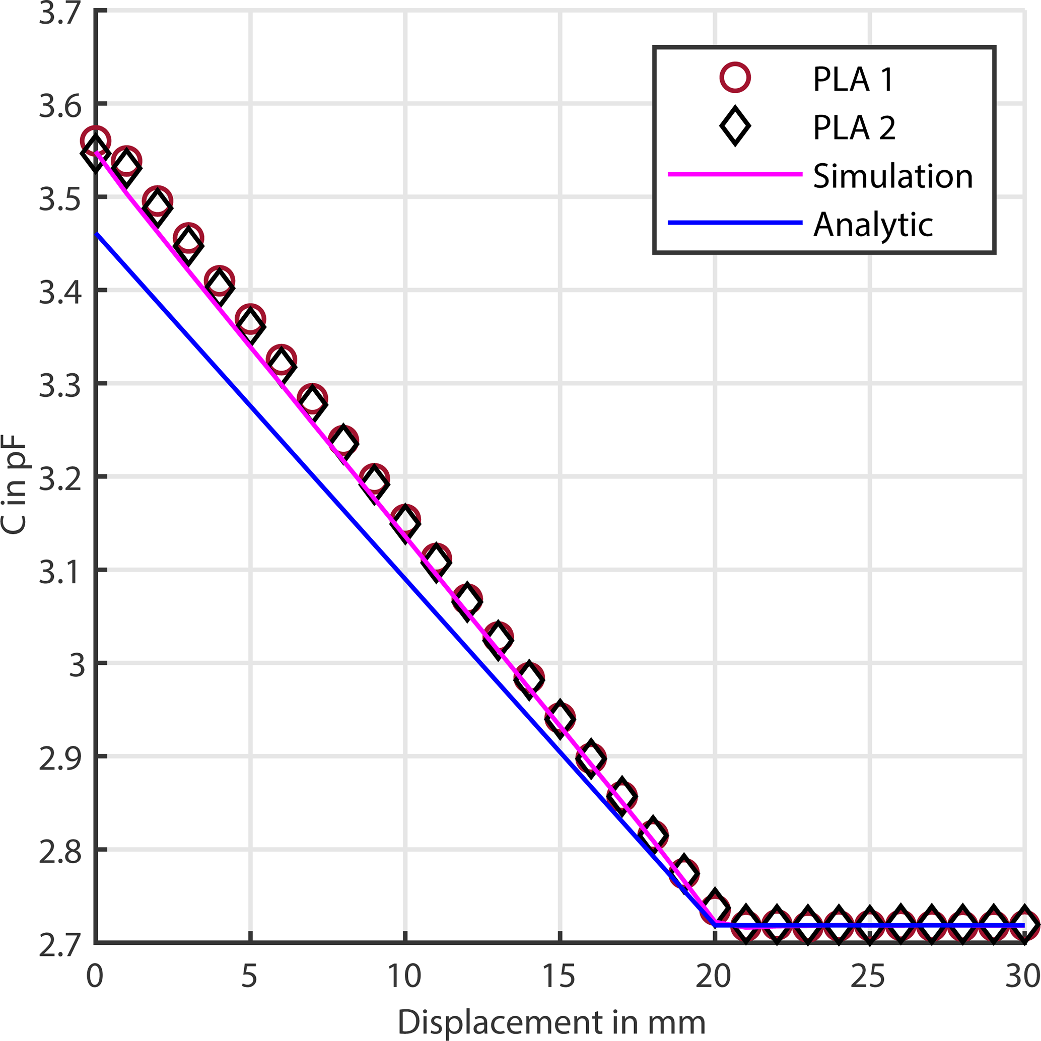 Figure 7Analytical, simulated and measured capacitance of the sensor for different displacements with different PLA pins.
