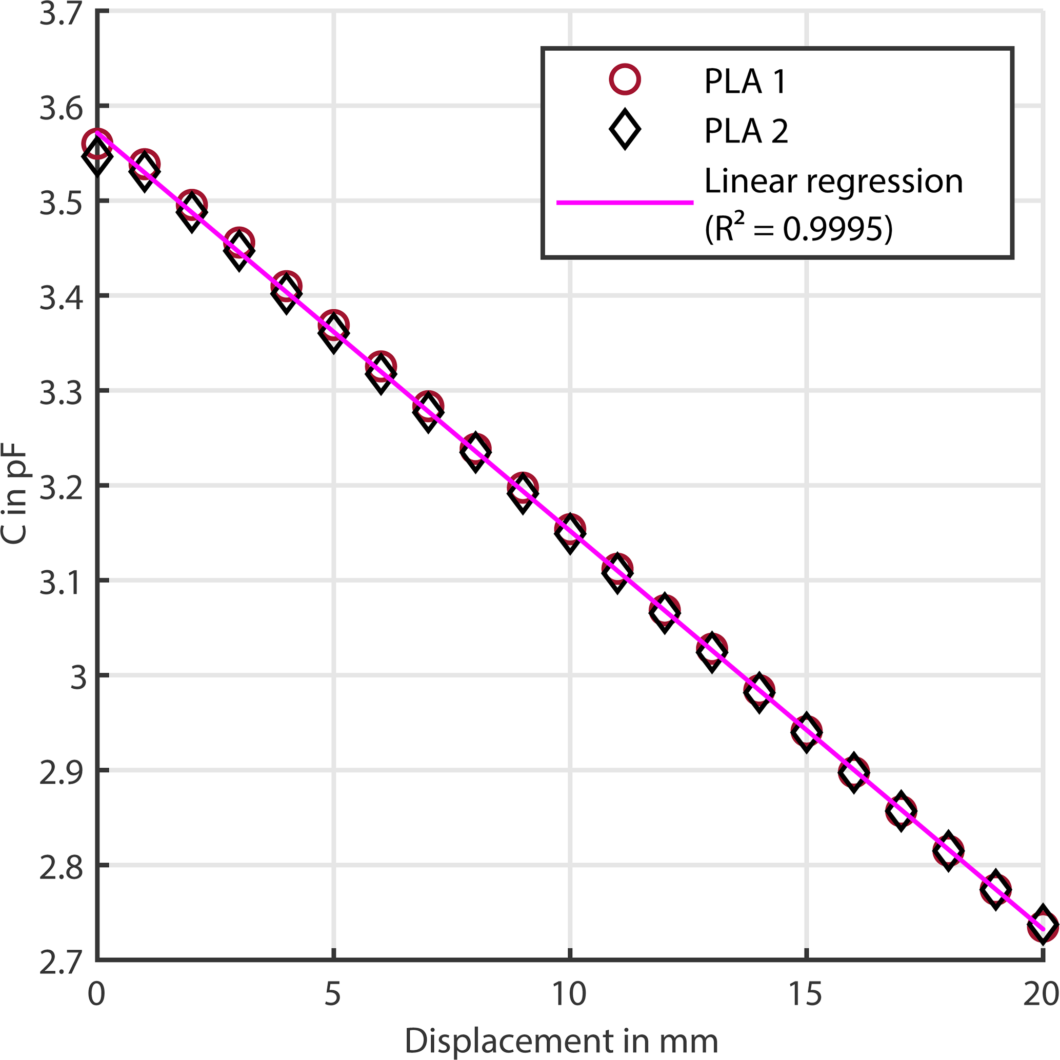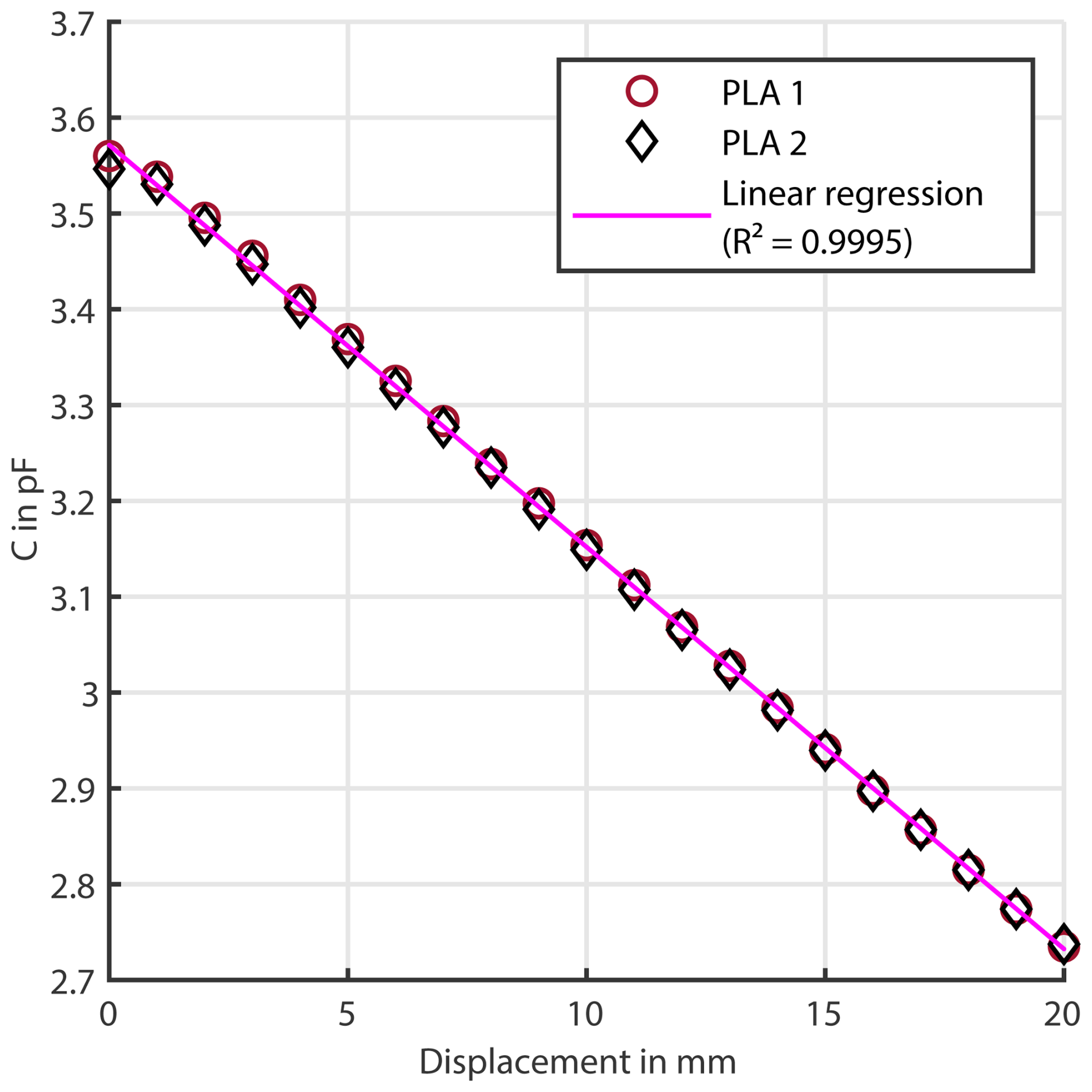 Figure 8Linear regression line for the measured capacitance of the sensor for different displacements with PLA pins.