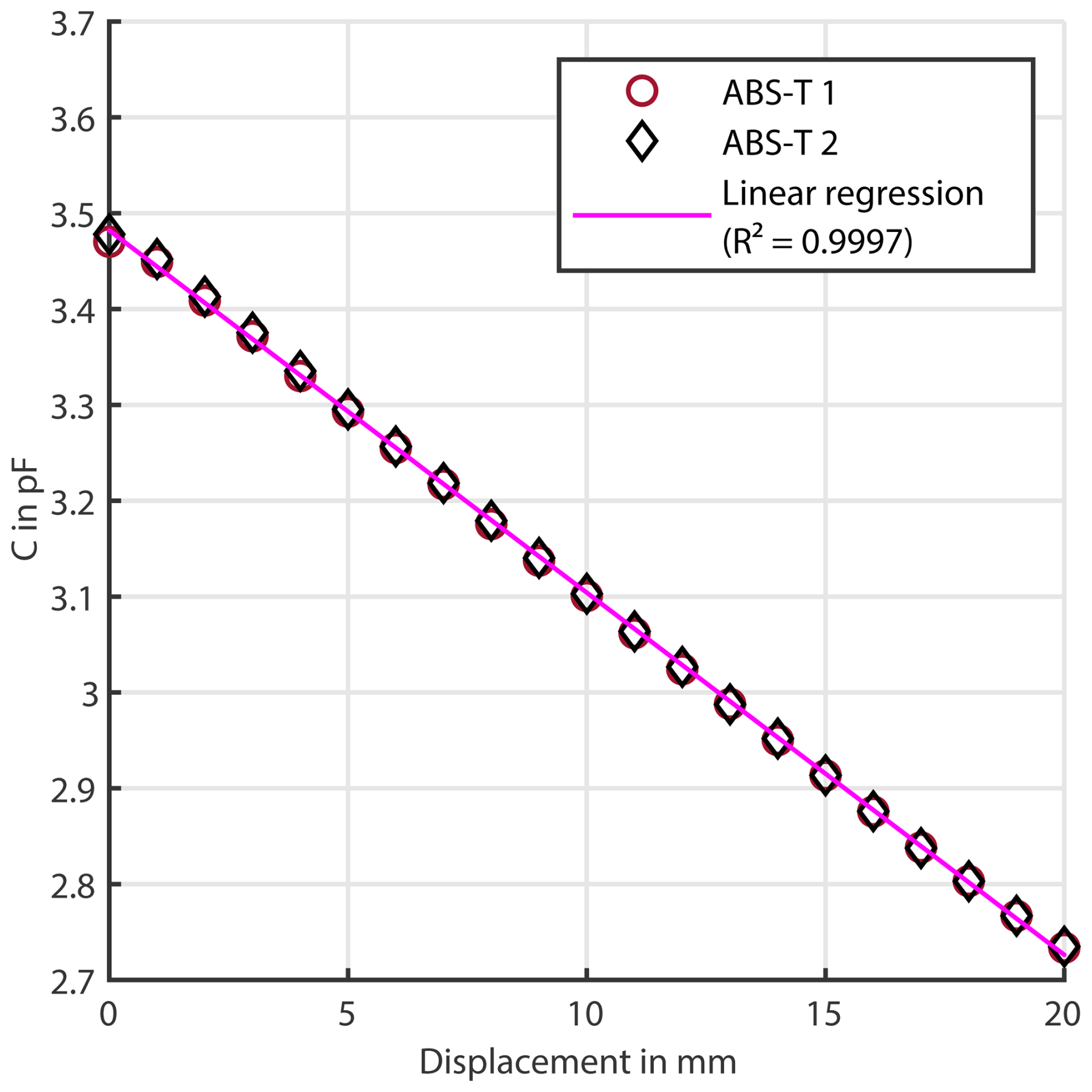 Figure 10Linear regression line for the measured capacitance of the sensor for different displacements with ABS-T pins.