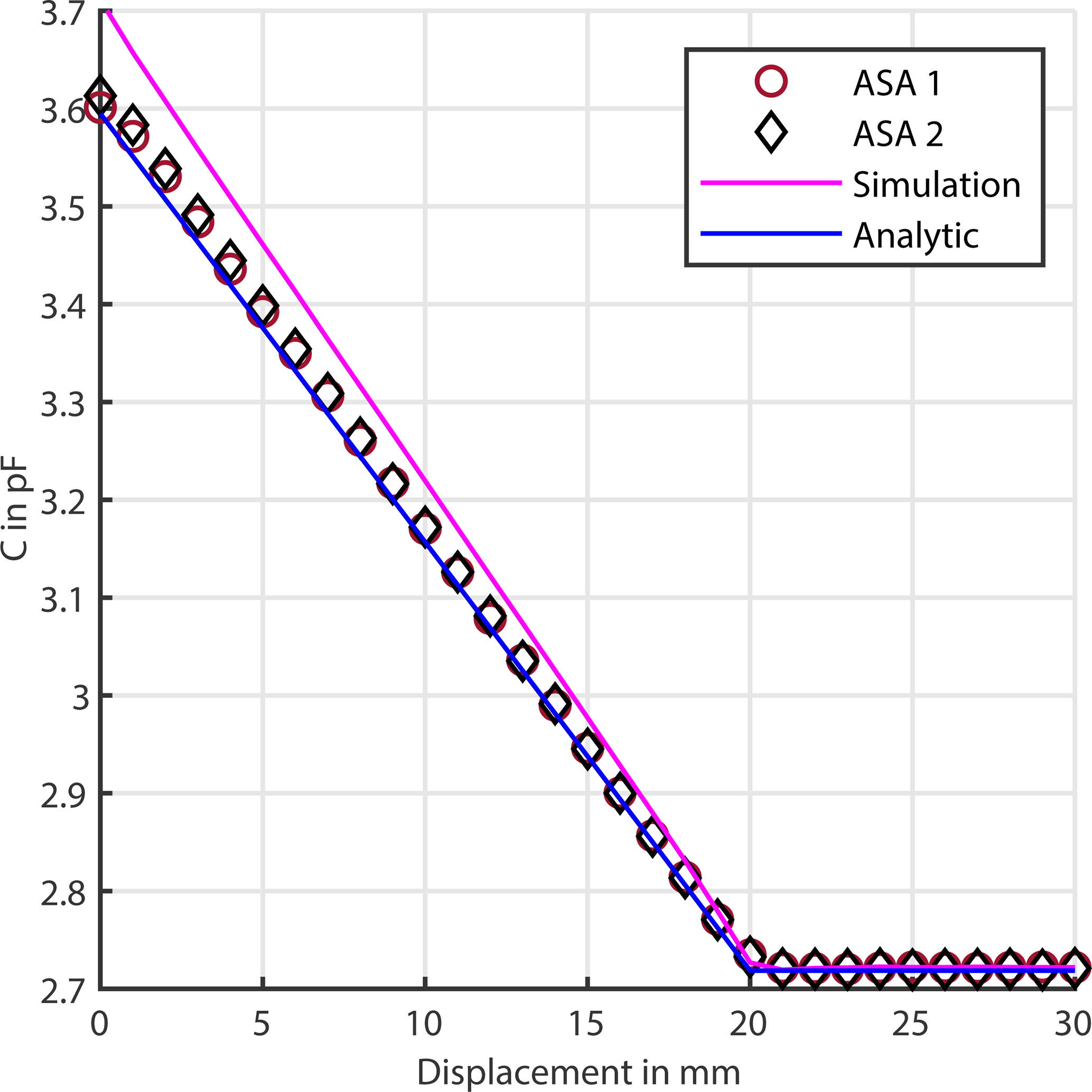 Figure 11Analytical, simulated and measured capacitance of the sensor for different displacements with different ASA pins.