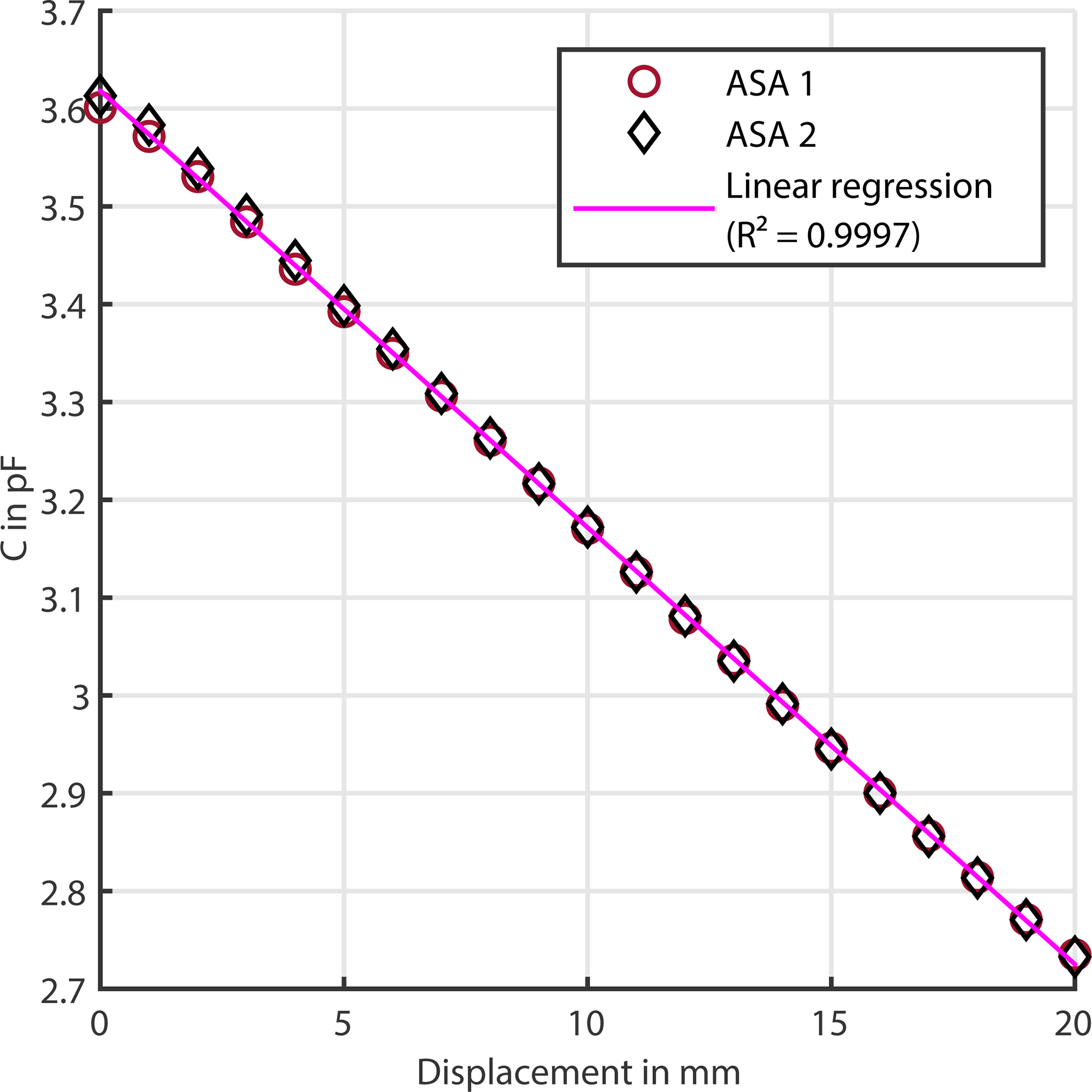 Figure 12Linear regression line for the measured capacitance of the sensor for different displacements with ASA pins.