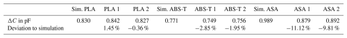 The average deviation of the measured capacitance change between a displacement from 0 to 30 mm compared to the numerical simulation varies with the samples and is shown in Table 1. This deviation stems from deviating material parameters and geometric deviations due to manufacturing tolerances. The assumed εr used for the simulation does not seem to fit in this case, especially for the ASA samples. There are different causes for the deviation: the different printer, filament, material batch, ambient conditions during production or the infill structure. The effect of these parameters on the εr is the subject of further study for more detailed simulation prediction. With the exception of the slope error related to the inaccurate εr, the measurements confirm the simulations. The sensor shows an approximately linear behaviour in the relevant measurement area. The plateau after 20 mm suggests that further displacement does not significantly affect the capacitance, indicating that the guiding electrodes are functional. Capacitance fluctuations at the edges of the sensing electrode due to fringing field effects could be minimised.