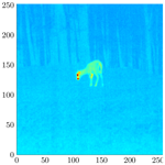 Practical measurements show that the presence of deer at a reference ambient temperature of 20 °C can be recognised both in the IR array and in the high-resolution Boson camera (Fig. 4). For our proof of concept, the standard configuration provided by Heimann, as shown in Table 1, is therefore sufficient. To extend the FoV to 90°, either a second sensor or a lens can be installed. However, as our evaluation shows, a larger FoV is linked to temperature resolution, which leads to lower distance resolution under the same environmental conditions. The single deer is 18 m away and, due to its body orientation, emits a large amount of heat, which the IR array maps over several pixels. By contrast, the deer on the left of the image is slightly farther away and aligned with the sensor system, resulting in a much lower heat signature.