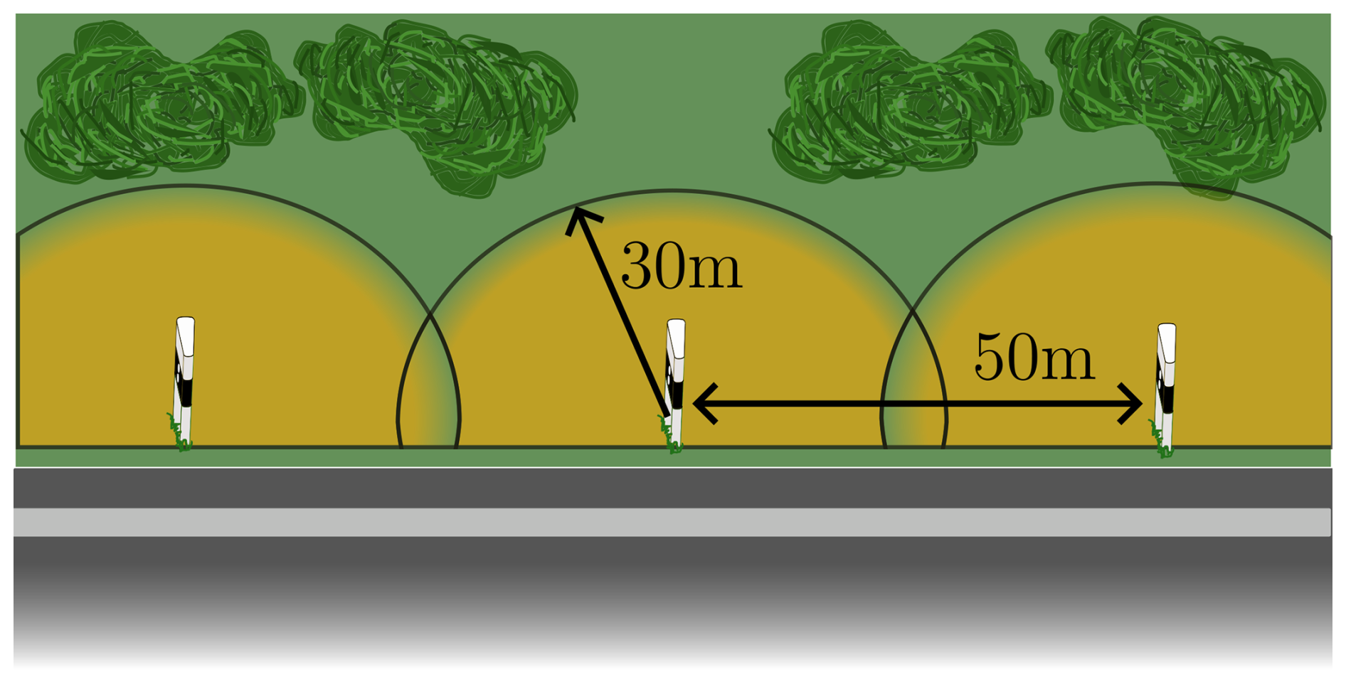 Figure 1The schematic represents a road with delineators. The distance between each delineator is 50 m, and the sensing radius of the sensors forms a 30 m half-circle radius around a delineator (Schneider et al., 2025) (https://creativecommons.org/licenses/by/4.0/, last access: 11 February 2026).