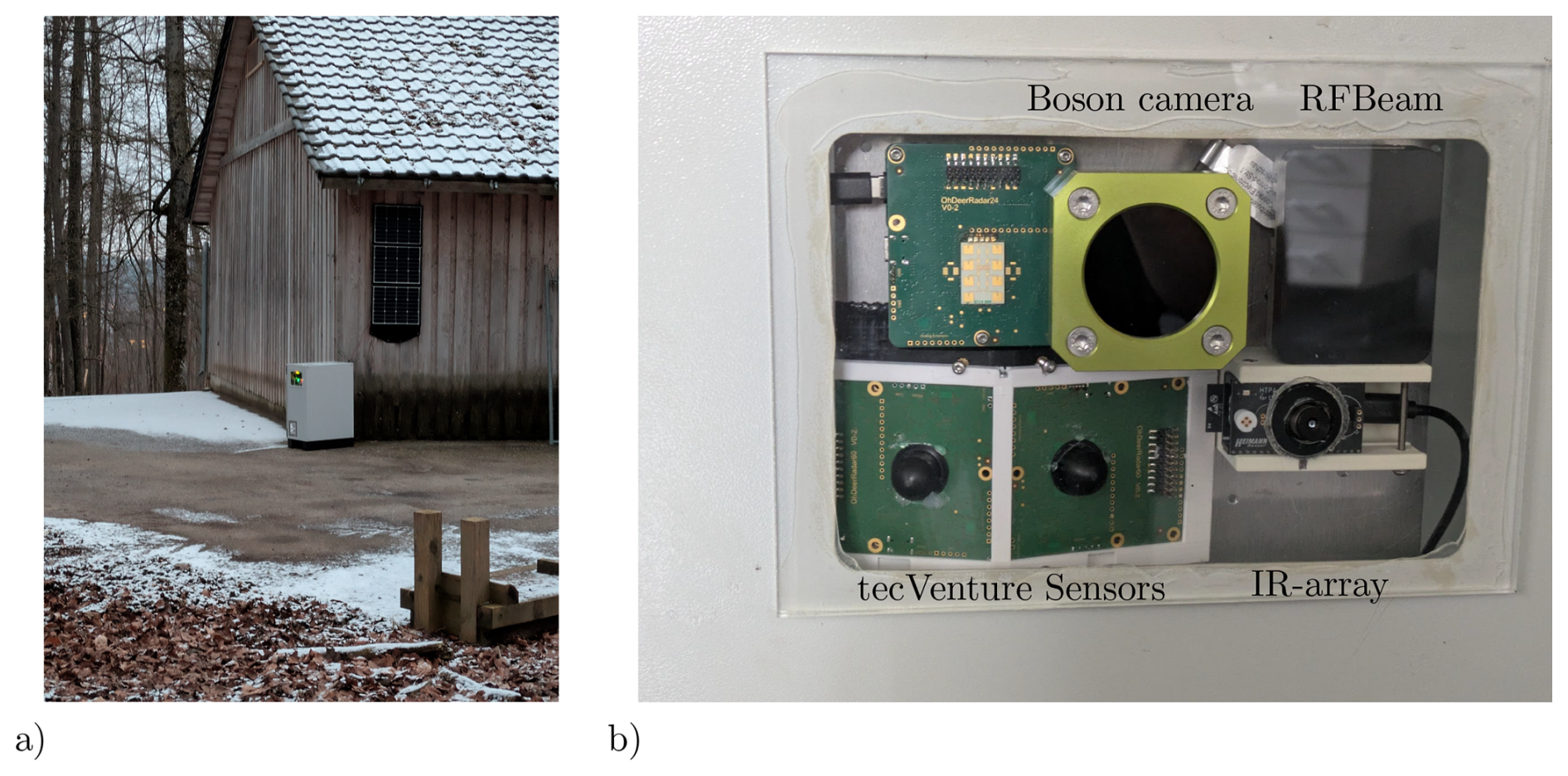 Figure 2Sensor system at a measuring location with animal-proof housing and solar modules in (a). (b) shows the sensors.