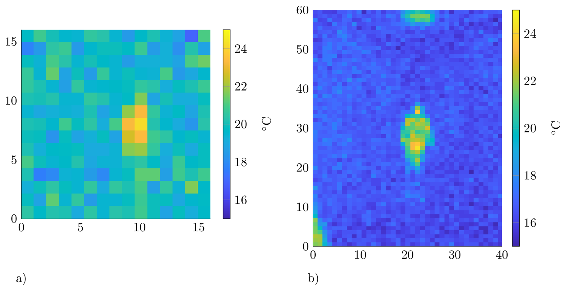For a first evaluation of detecting, a person was positioned in front of the sensors at the same distance and at different ambient temperatures. For example, as Fig. 3 shows, the person is easily recognisable at a distance of 14.5 m in a resolution of 60 × 40 pixels at an ambient temperature of 18 °C. However, at a resolution of 16 × 16 pixels, the person can no longer be identified due to the lower resolution in the same ambient temperature. This can be described by the spot size ratio (Playà‐Montmany and Tattersall, 2021). If this is converted to the pixel area A, Eq. (1) is obtained. Here, d corresponds to the object distance andn corresponds to the number of pixels in the azimuth and elevation directions, respectively. However, using this equation to determine the maximum distance between objects in correlation to object size is incorrect. The reason for this is optical dispersion. This phenomenon describes how the thermal radiation, emitted from a small area, does not provide sufficient energy to the individual pixel. For a reliable measurement, the measuring point should therefore cover a resolution of at least 3 × 3 pixels (Wang et al., 2019). According to this theory, the target is already too far away for the sensor in Fig. 3a, because if the ambient temperature rises, only one pixel would show the person. Therefore, the further measurements are limited to the IR array with the 60 × 40 pixels. This sensor is therefore appropriate for the distance mentioned above, up to an ambient temperature of approximately 26 °C.