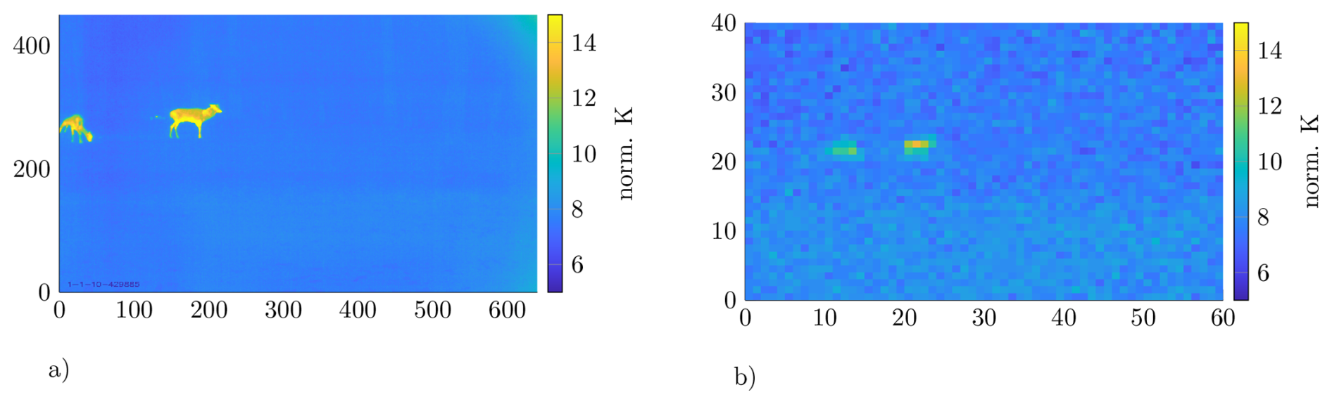 Figure 4Two deer are located approximately 18 m from the sensor system. (a) shows the high-resolution thermal image captured by the Boson camera, while (b) shows the image captured by the IR array.