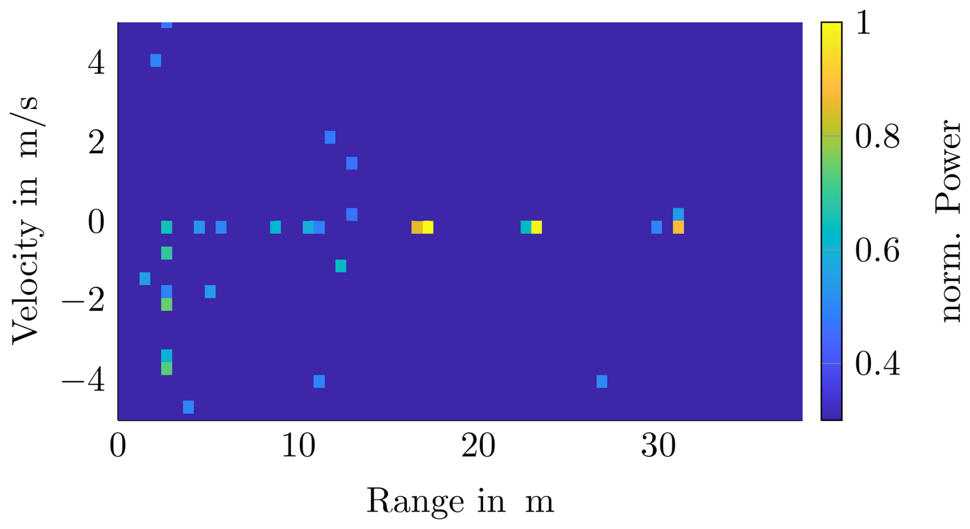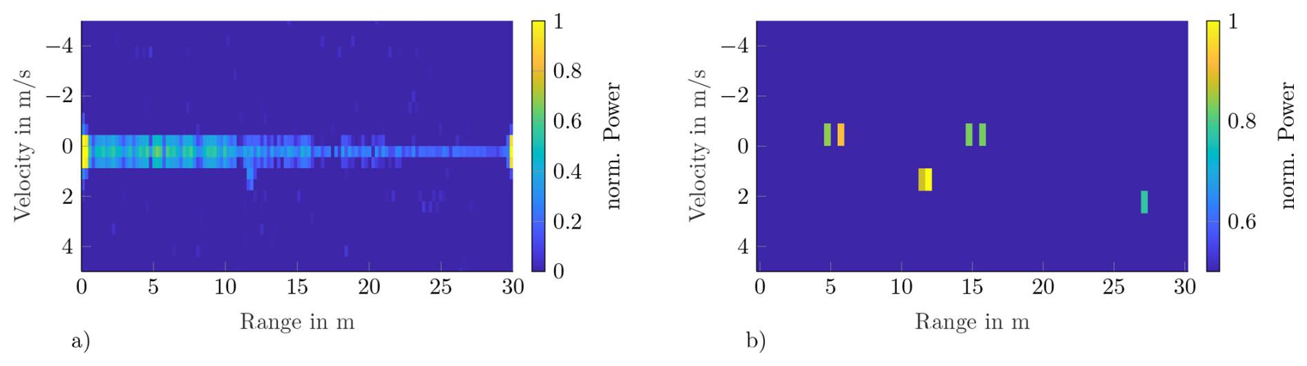 The 60 GHz radar sensor from RFBeam with integrated signal processing enables a maximum range of r=30 m with a range resolution of ΔR=0.23 m and a velocity resolution of Δv=0.43 s (Fig. 6) and still has an FoV of azimuth °. This makes it suitable for installation in our sensor system. Using a moving target indication filter (Tohidi et al., 2015), static targets can be filtered without compromising the signal-to-noise ratio. This makes it possible to detect a deer at a distance of up to r=30 m.