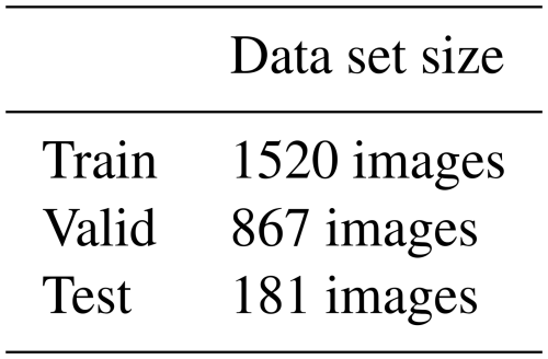 As part of an initial trial, a convolutional neural network (CNN) was evaluated for its capacity to automatically detect deer that pose a threat to traffic safety. Due to the inability to clearly identify detection in radar data, the co-registration approach is to be utilised. Prior to the execution of the aforementioned procedure, it is necessary to first evaluate the thermal images. Given the simplicity and rapid detection rate of the YOLO (You Only Look Once) model, it was selected as the primary approach for the segmentation process. As in Wang et al. (2024) and Turmaganbet et al. (2025), the YOLO (Ultralytics, 2023) CNN was used for automatic referencing. To achieve this, the 16-bit greyscale images from the Boson camera were cropped to 8 bits using mean-value nomination. This is necessary because thermal intensity is expressed as a relative number of 16 bits; thus, the measured relative temperature of each pixel is mapped to this value range. Additionally, YOLO is optimised for evaluating 8-bit RGB images. Due to the CNN's architecture, YOLO always requires three individual images (R, G, and B), which are superimposed to form the overall image. To analyse the impact of converting 16-bit thermal images to 8-bit false colours, YOLO was trained twice with the same images and data distribution (Table 2). For this evaluation, a random selection of images was chosen, which were manually marked and provided with bounding boxes indicating where and how many animals were present. The selected images were then divided into two classes: with deer and without deer. Three sets of different sizes were formed from these classes (Table 2). Due to the false-colour representation and the greyscale scaling, there are now six sets, three each for processing in the CNN.