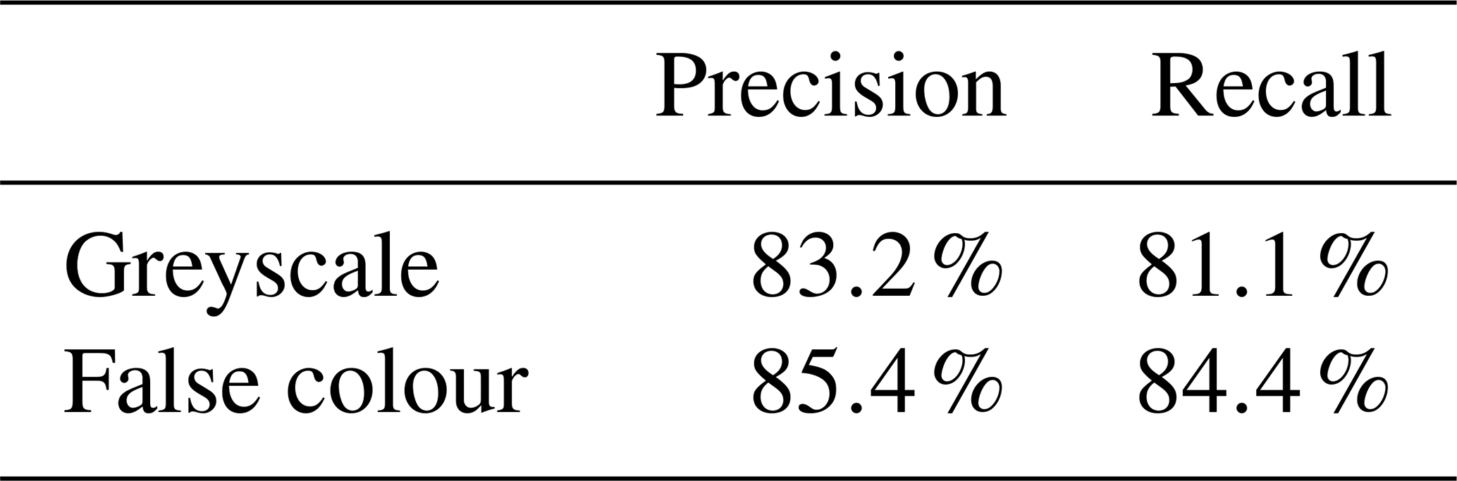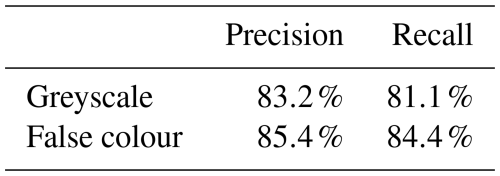 The recall is particularly noteworthy when assessing the training cases, as it demonstrates the number of deer that can be detected. The false-colour representation is 84.4 %, about 3 points higher than the grey image. The precision evaluation shows an even smaller difference, with the false-colour representation at 85.4 %, only 2 points higher. Deer are mainly not detected in the recall when they are at a great distance (20 m or more) from the measuring system or when a large part of the animal is obscured by vegetation.