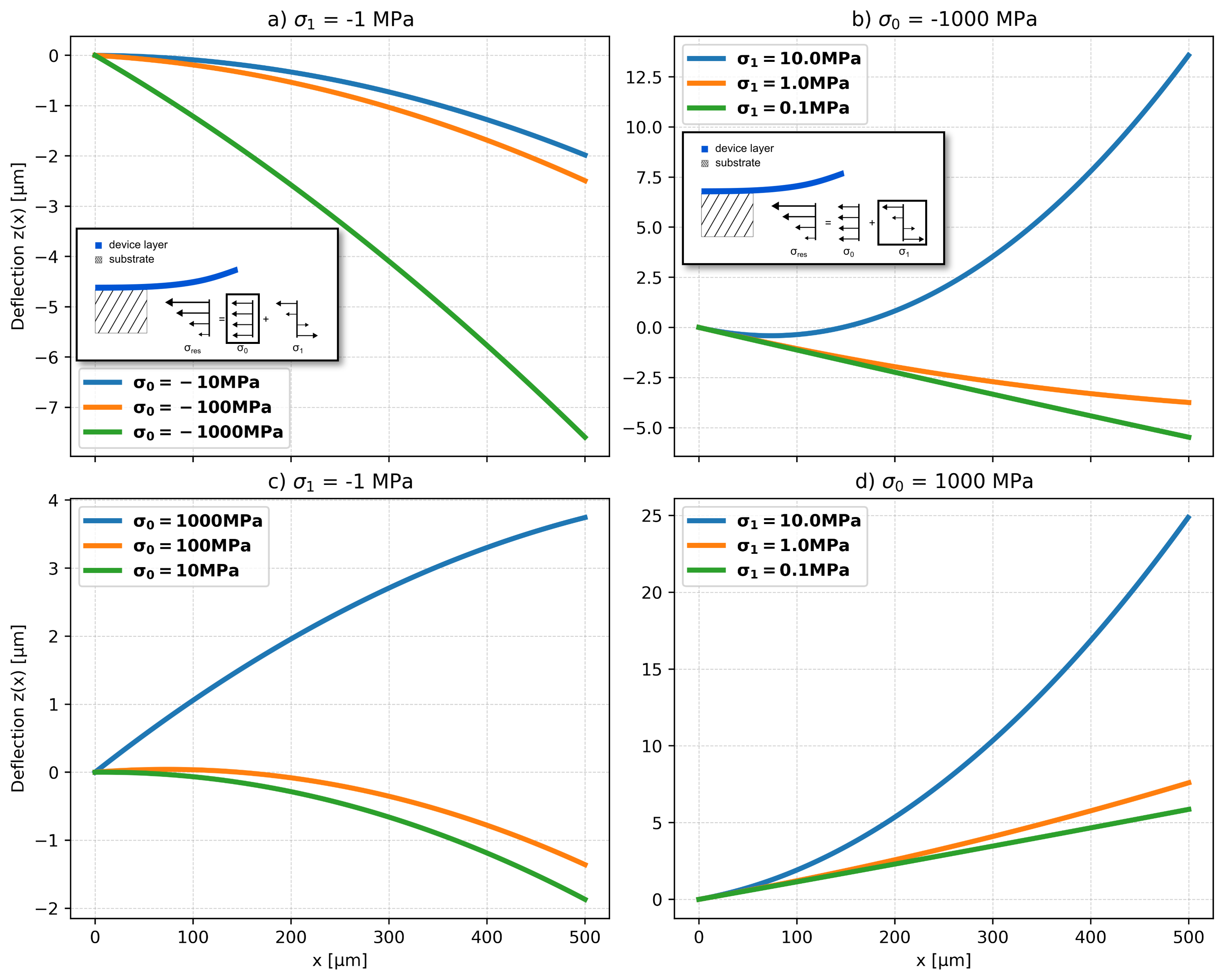 The separation into tilt and curl is illustrated in Fig. 1. In Fig. 1a and b, the mean stress σ0 is negative, equal to a downwards tilt. The superposition of a negative gradient stress further curls the beam down, as shown in Fig. 1a. In Fig. 1b, the superposition with positive σ1 results in a positive value of the 500 µm long cantilever for the deflection at the tip z(x=500 µm), already for σ1=10 MPa, which is 2 orders of magnitude lower than the absolute value of σ0. In Fig. 1c and d, σ0 is positive; hence the tilt points upwards. Again, the superposition with σ1 leads to an additional curl in the corresponding direction. In Fig. 1c, similarly to Fig. 1b, a gradient stress 2 orders of magnitude smaller than the mean stress is able to change the sign of the static deflection at the tip of the cantilever. In conclusion, it can be stated that the amplitude of the static deflection depends much more on σ1 than on σ0. This behavior of the static deflection can also be seen in Eq. (4), where σ1 contributes to both the linear and the quadratic term, while σ0 only affects the linear term.