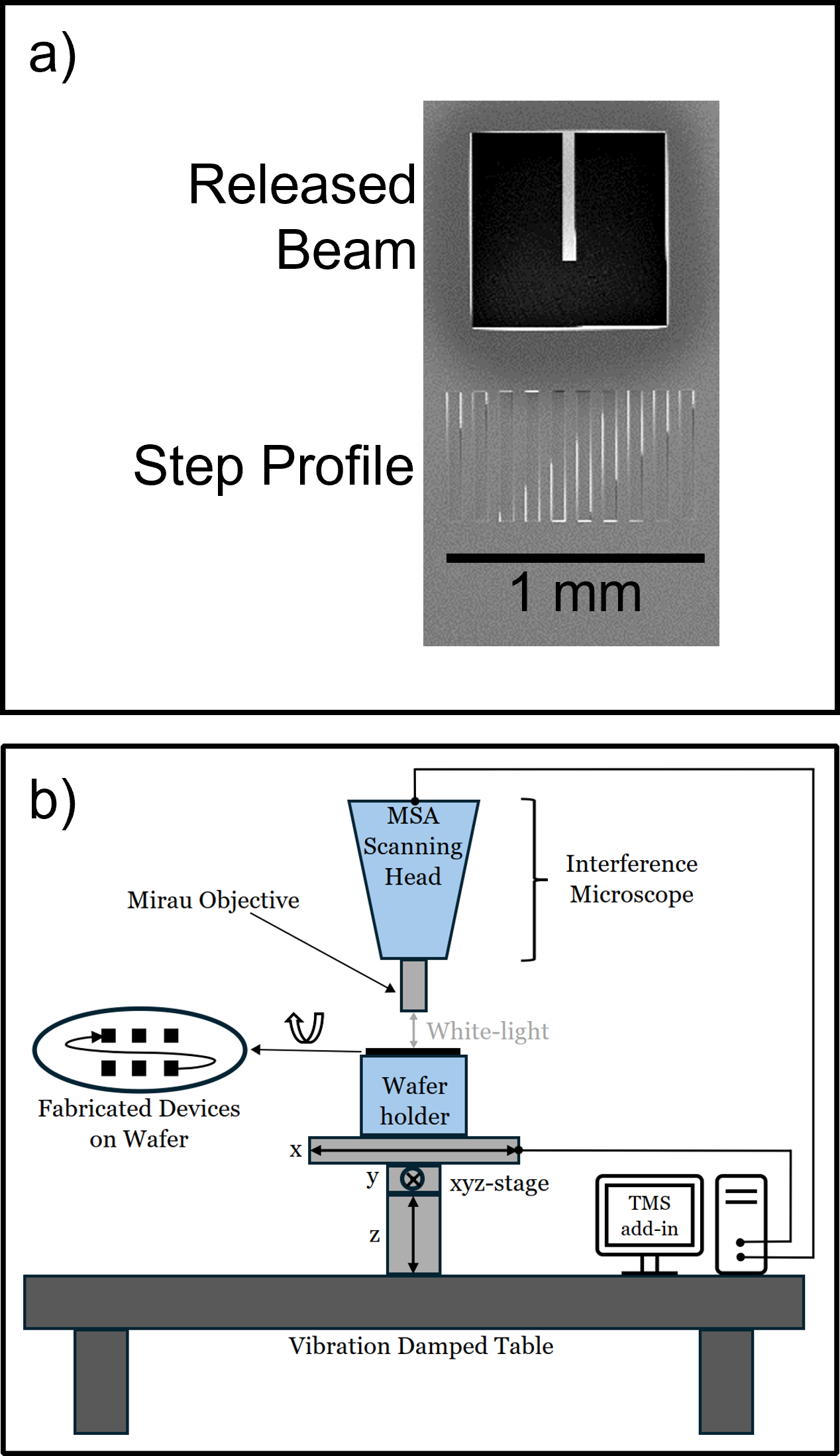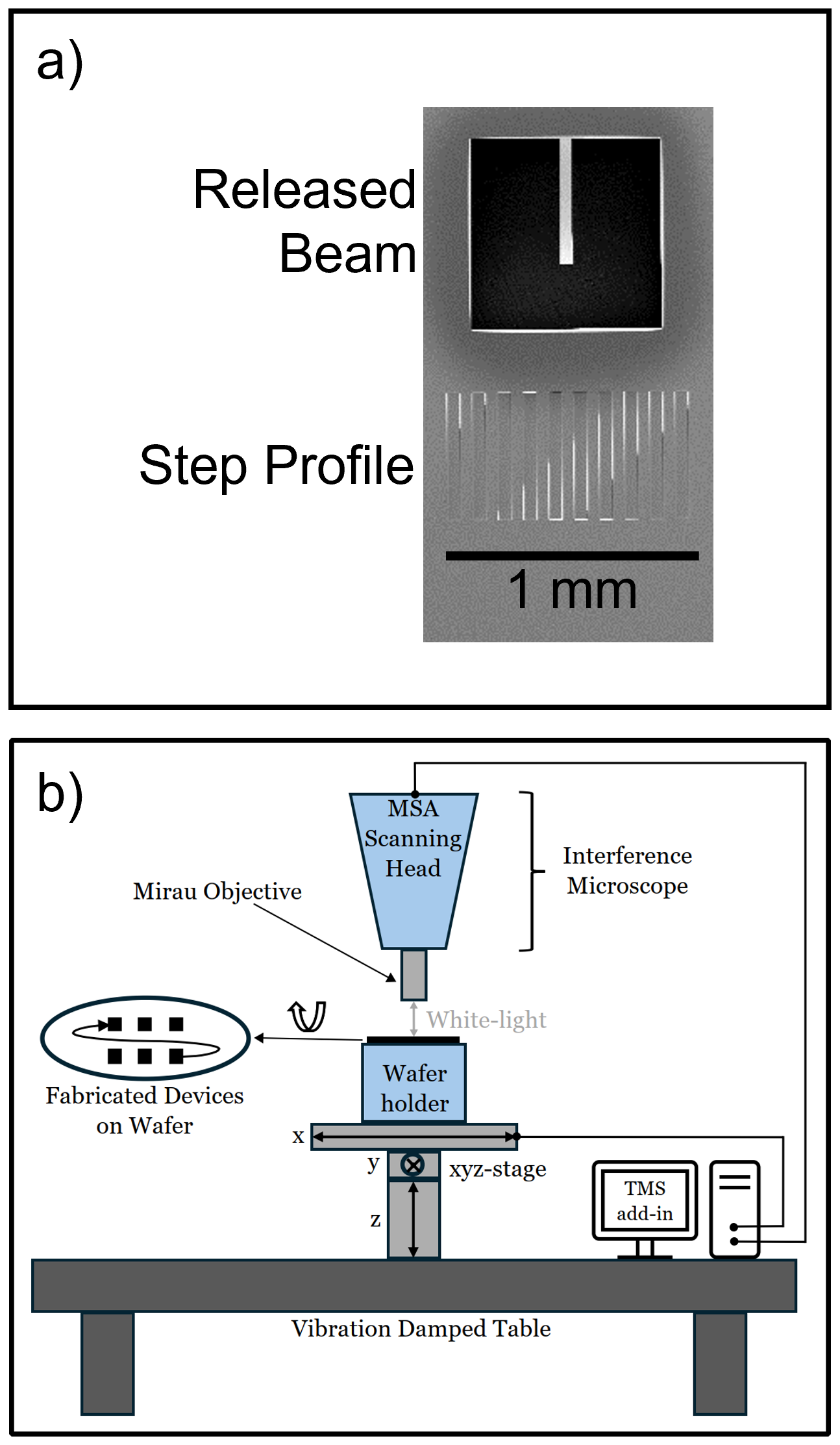Figure 2(a) The automated contactless characterization of the local thin film thickness and stress uses a standard MEMS test structure with a cantilever and a step profile. (b) The WLI measurement setup consists of an MSA-400 equipped with a Mirau objective and an XYZ-stage.