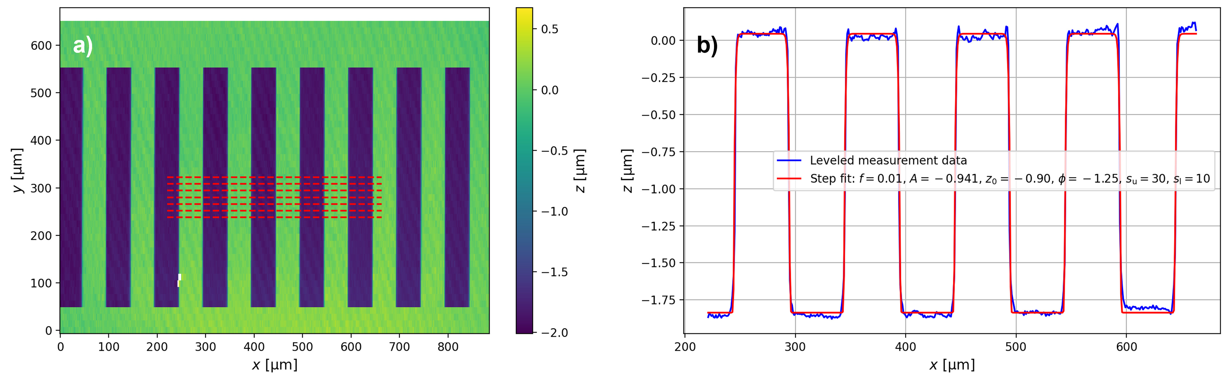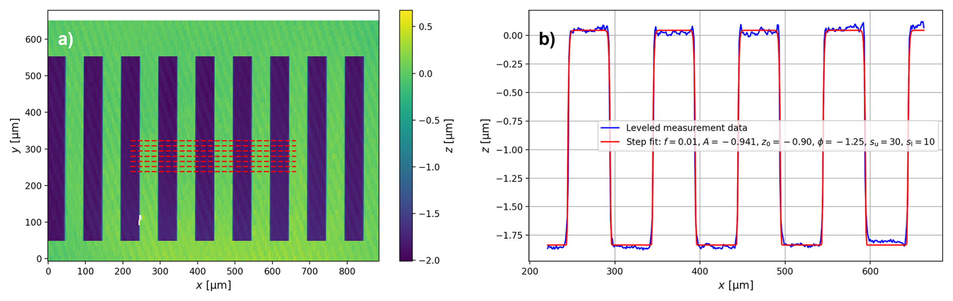 From the three-dimensional scan of the SP, we extract an averaged profile line perpendicular to the etch trenches with several edges after the frontside etch, as shown in Fig. 3 for l-PCSi. In advance, leveling is performed, such that the upper plateaus of the SP are leveled out and set to 0. Even more, the leveling ensures that the maximum trench depth can be extracted accurately from the measurement data. A spatial step function zstep is designed to cover the specific shape of the trenches with rounded corners resulting from the dry-etching process: