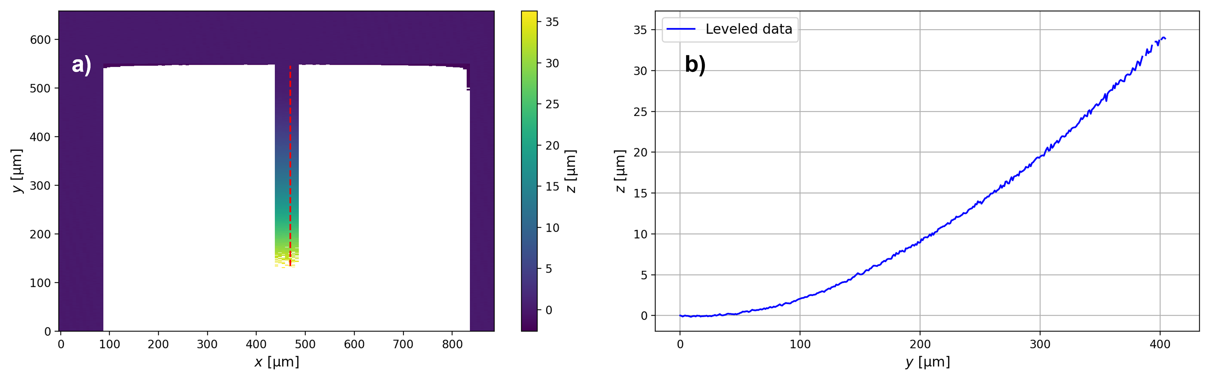 Figure 4(a) Typical leveled topography measurement of a l-PCSi beam. (b) Extracted deflection curve of the beam from the topography measurement.