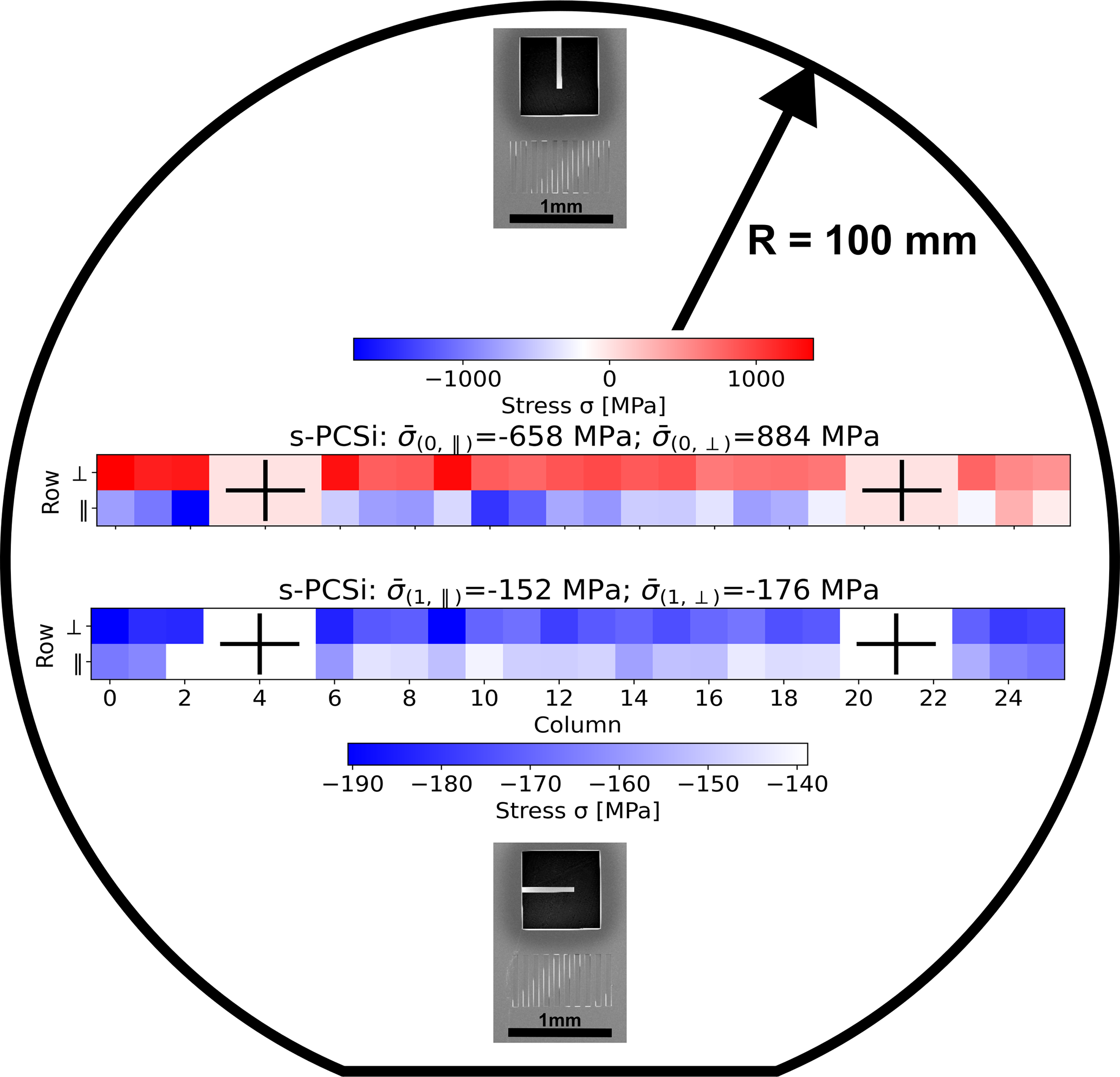 (Meindlhumer et al., 2024)(Klein and Cardinale, 1993)(Hopcroft et al., 2010)(Hopcroft et al., 2010)(Hopcroft et al., 2010)(Hopcroft et al., 2010)(Huber et al., 2025a)(Jackson, 2005)Figure 5Beams oriented parallel and perpendicular to the wafer flat are arranged in rows of 20 devices across the 4-inch (100 mm) wafer. For the presented data of s-PCSi, the local thickness is measured with the step profile (SP) and used to determine the mean stresses and (in the upper part of the figure) and the gradient stresses and (in the lower part of the figure). While for the gradient stresses all devices show negative (compressive) stresses, most of the devices parallel to the flat show negative mean stress, but all devices perpendicular to the flat show positive (tensile) .