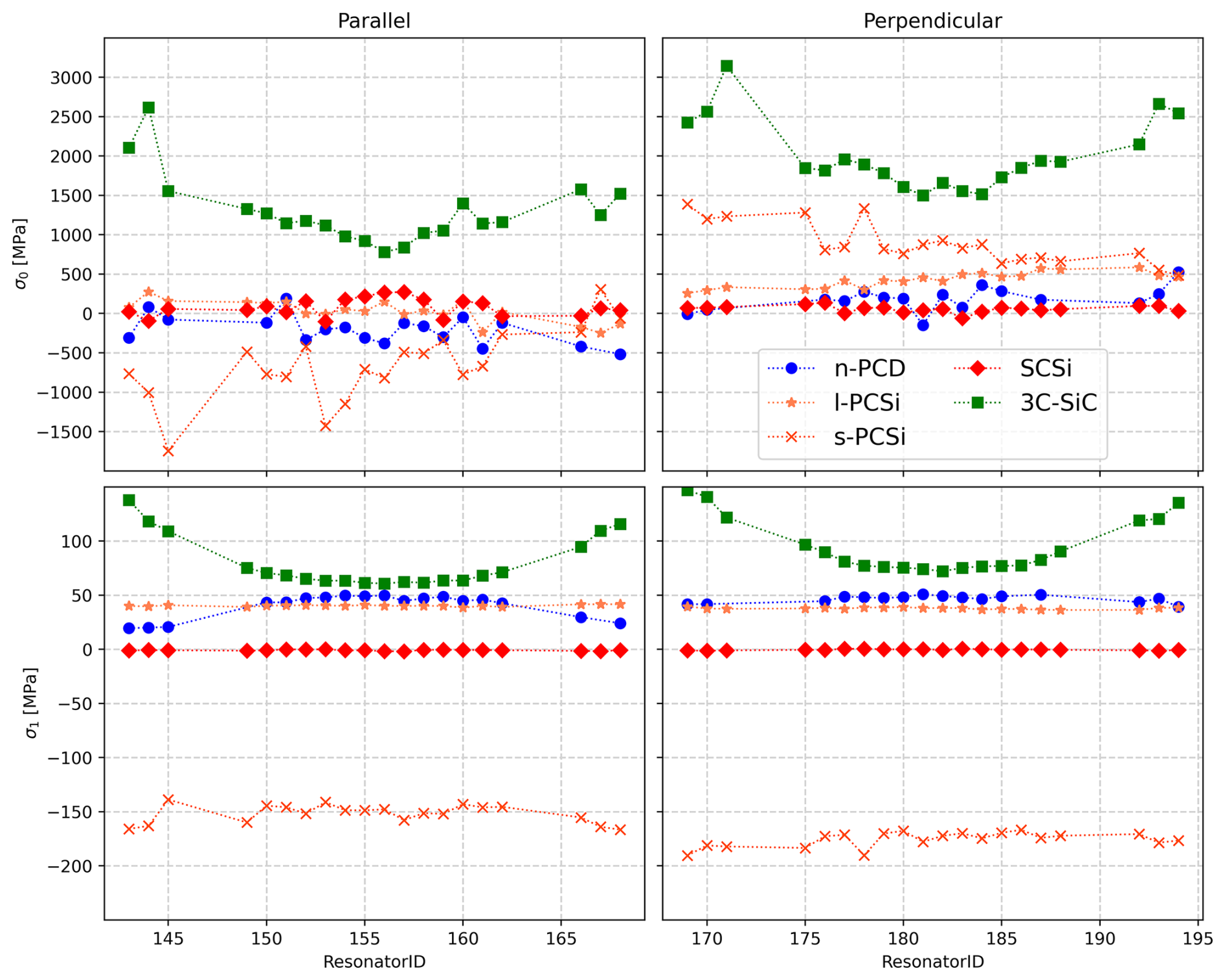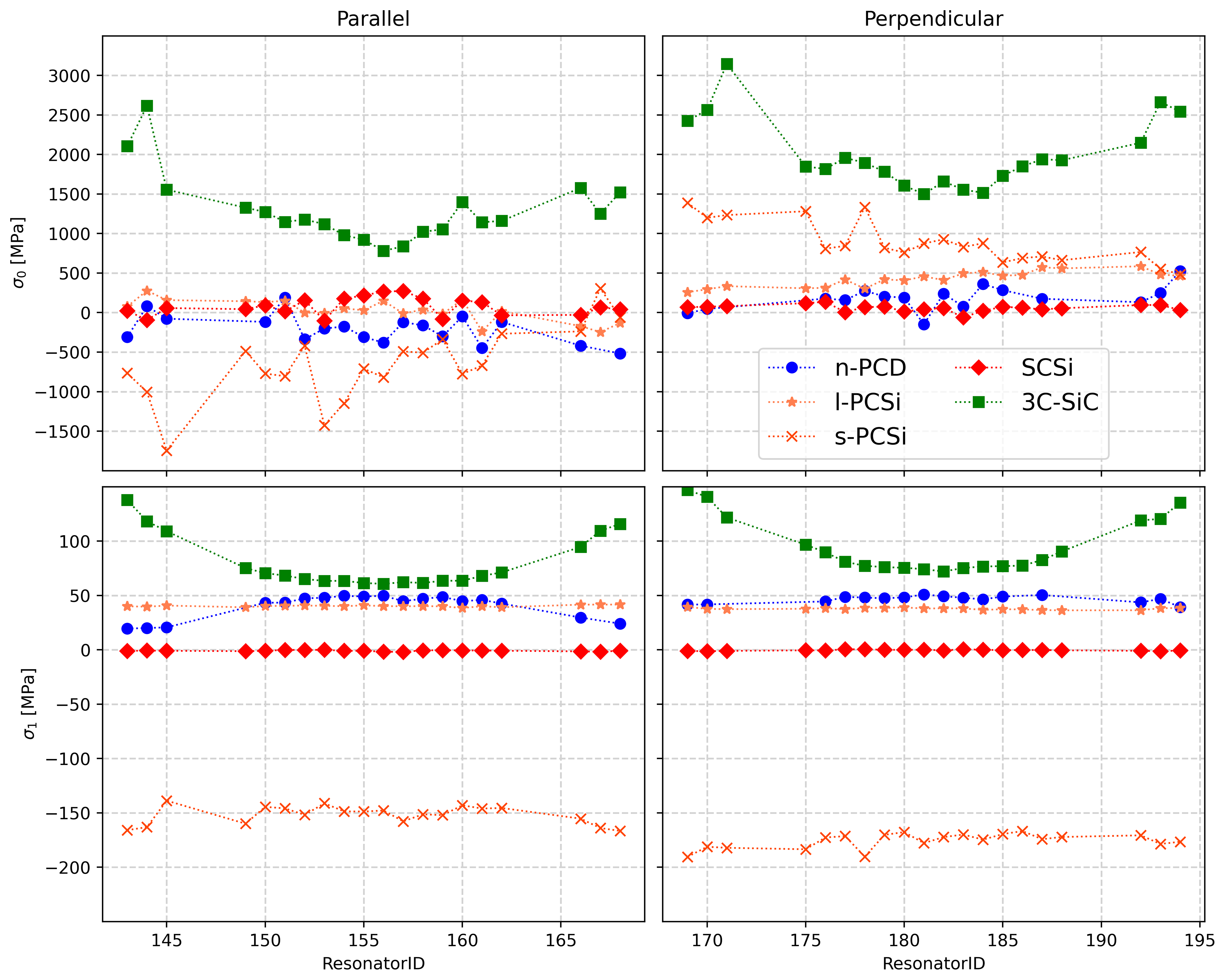 Figure 6The mean stress (in the upper half) and the gradient stress (in the lower half) are shown for parallel- and perpendicular-oriented devices, relative to the wafer flat. A total of 20 devices for each orientation are measured with a length of 500 µm and a width of 50 µm. While σ1 does not show any orientation dependence, the mean component of the stress changes from parallel to perpendicular for n-PCD, l-PCSi, and s-PCSi. The inserted lines serve as a visual guide.