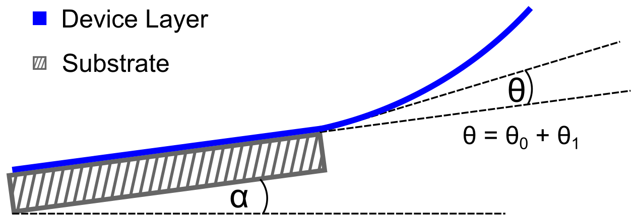 The direction-dependent mean stress σ0 measured for the polycrystalline silicon device layer with large grains in the range of ≈100 nm (l-PCSi), the polycrystalline silicon device layer with small grains in the nanometer range (s-PCSi), and the polycrystalline diamond device layer with small grains in the nanometer range (n-PCD) can be caused by several parameters during the deposition. Non-uniform temperatures in the CVD process, along with asymmetric gas flows, can lead to an anisotropic stress distribution in the wafer. Furthermore, the CTE is highly temperature-dependent, and even for SCSi and PCSi, the parameters differ by roughly a factor of 2 for different temperatures, as described by Mazur and Gasik (2009) for SCSi and by Tada et al. (2000) for PCSi-SiO2 stacks. The CTE is also dependent on the crystal orientation of the thin film, especially for SCSi, but also for PCSi, if there is a preferred growth direction. However, the identification of the microstructural origin of the direction-dependent stress is outside the scope of this work. Furthermore, the fitting procedure due to the leveling within the applied method is critical for the extraction of the correct mean stress, and the results shown for σ0 need to be used carefully, since small measurement and fitting uncertainties have a huge impact on σ0. A schematic is shown in Fig. 7, where the angle α represents the leveling error. The angle θ is the tilt of the beam at the anchor and is calculated as the sum of θ0 and θ1. Since θ1 is fixed by σ1 and the measured radius of the curvature R in Eq. (5), the leveling error in a measurement is directly added to θ0 and hence to σ0. An uncertainty of the leveling resulting in a device tilt α=1 mrad for a 2 µm thick beam leads to a variation in σ0 of 90.7 and 341 MPa for SCSi and n-PCD, respectively.