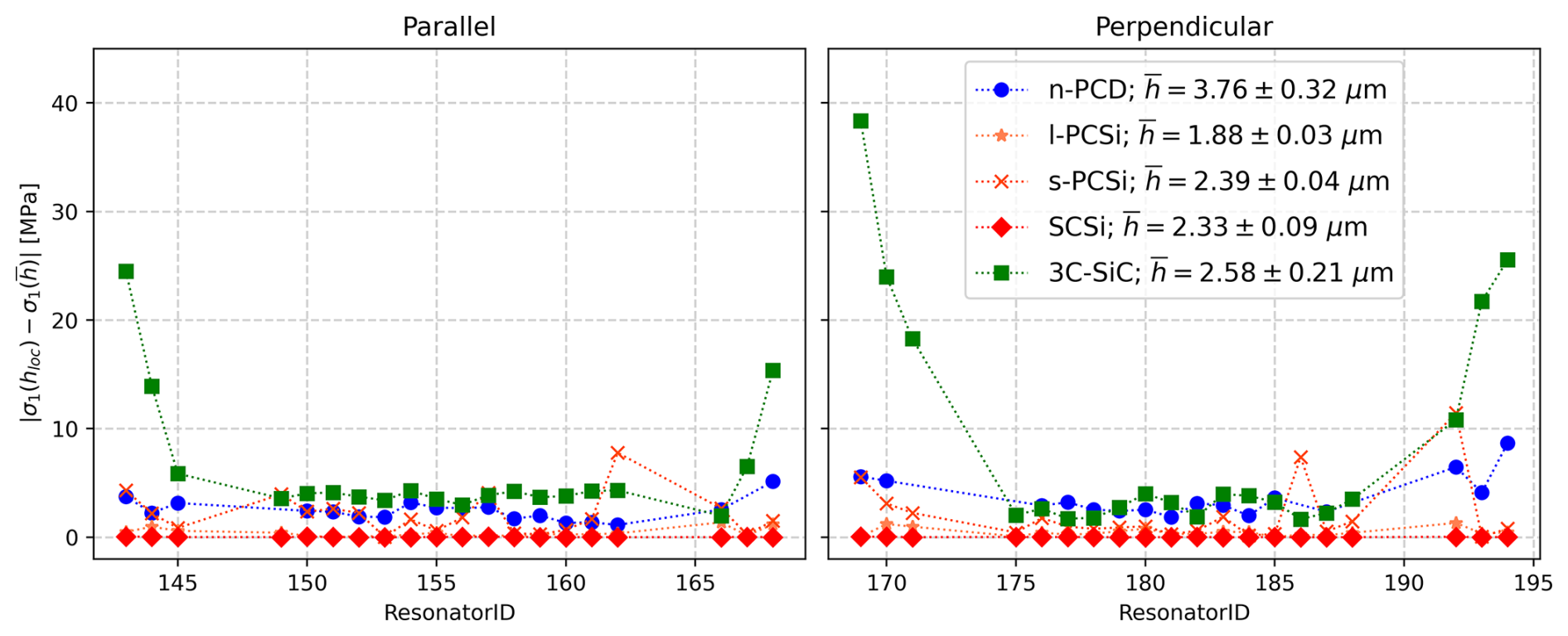 As already mentioned, the extraction of σ1 from the measured curvature of the cantilevers leads to a symmetric result for parallel and perpendicular devices. For the gradient stress, the influence of the device tilt is irrelevant, and a closer look at the effect of the local thin film thickness on σ1 is done in Fig. 9. To do so, we calculated the average thin film thickness for the 40 studied devices per device layer and show the difference between the gradient stress calculated with the local thin film thickness hloc and the one with per device in both directions, parallel and perpendicular to the wafer flat. While the difference is below 10 MPa in most of the measurements, it reaches up to 38 MPa for PCSiC at the edge of the wafer, indicating the high precision of the presented combination of film thickness and film stress measurement.