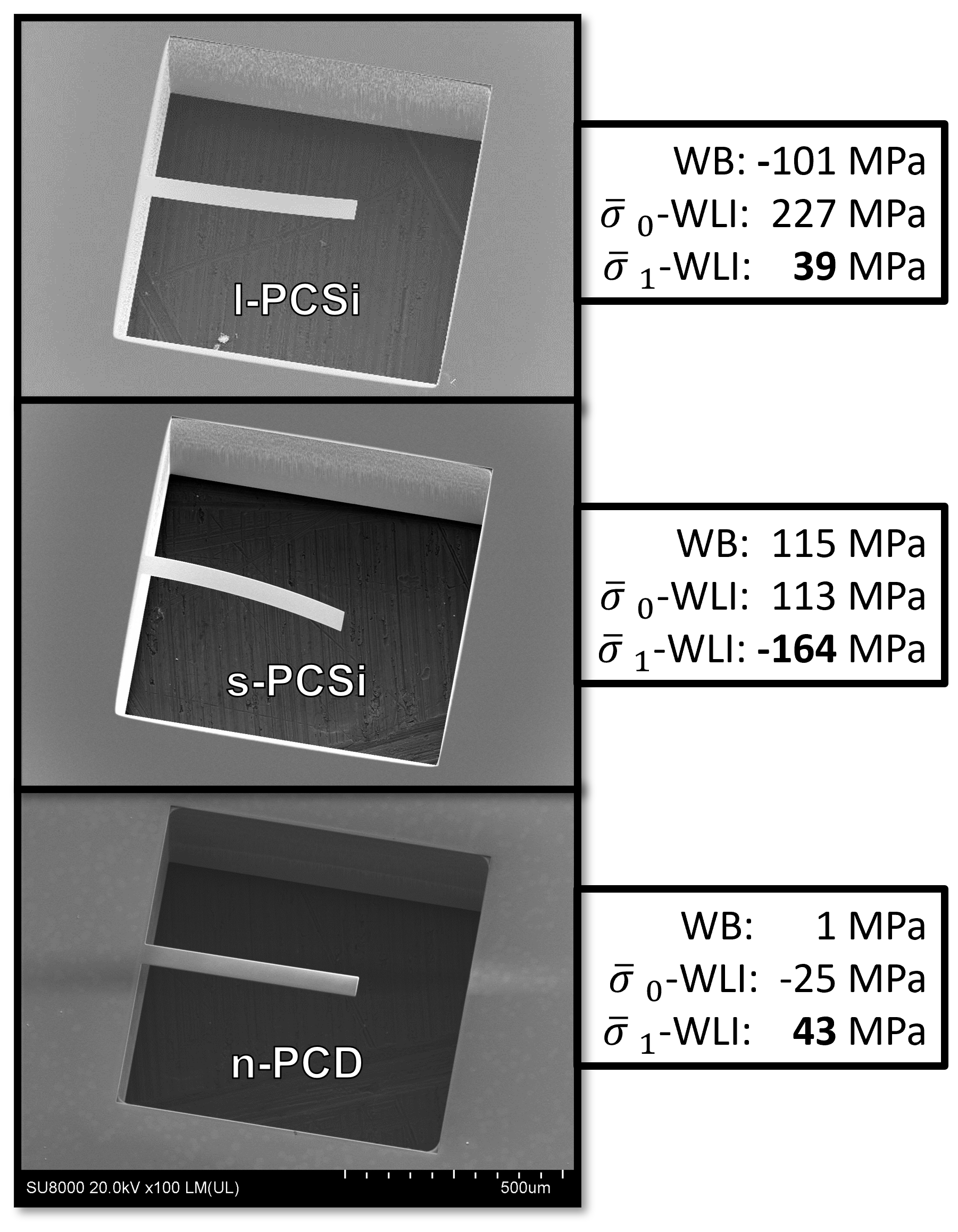 Figure 10SEM images of representative cantilevers from the l-PCSi, s-PCSi, and n-PCD thin films with the measured stress values from wafer bow (WB) and WLI techniques.