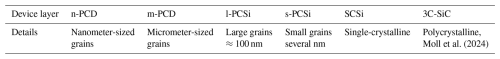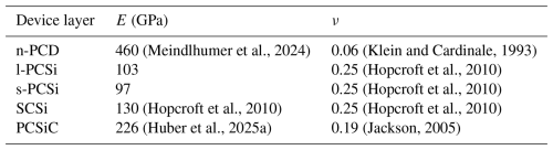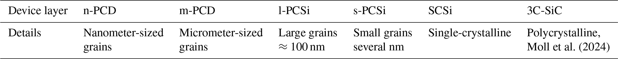 Different silicon, 3C-SiC, and diamond device layers with various thicknesses, microstructures, and mechanical properties are investigated on phosphorus-doped 〈100〉-oriented silicon substrates covered with a wet thermal oxide, summarized in Table 1. The deposition of polycrystalline 3C-SiC is performed in an LPCVD system. An alternating supply deposition (ASD) working with alternating gas flows of propane and silane with intermediate pump-out times is utilized, as described in Moll et al. (2024). Polycrystalline diamond (PCD) thin films from CarbonCompetence GmbH are fabricated in an HFCVD system at elevated temperatures from methane and hydrogen as precursor gases. For deposition of the PCD films with grains of several micrometers in diameter (m-PCD) and PCD films with small grains in the range of several nanometers (n-PCD), the temperature of the Si substrate was set to 800–850 °C and a total gas pressure of 5 mbar was applied, while the filament-to-substrate distance was maintained at 50 mm. The applied gas flows for the deposition of m-PCD and n-PCD films are set to CH4 H2 ratios of 0.1% and 2%, respectively. Further details on the deposition parameters can be found in Meindlhumer et al. (2024) and Huber et al. (2024). The grown thin films are benchmarked with single-crystalline silicon (SCSi) from a commercially available SOI wafer and with polycrystalline silicon (PCSi), as these are standard materials for MEMS devices. Two depositions of PCSi in an LPVCD system are performed at different temperatures, leading to very small nanosized silicon grains (s-PCSi) at a deposition temperature of 568 °C and larger grains by 2 orders of magnitude (l-PCSi) at a deposition temperature of 600 °C.