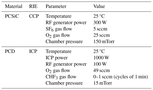 Moll et al. (2024)A Bosch process is used for micromachining single- and polycrystalline silicon. Furthermore, we developed suitable dry-etching recipes for PCSiC and PCD in a capacitively coupled plasma (CCP), STS RIE, and in an inductively coupled plasma reactive ion etcher (ICP RIE), Oxford Plasmalab 100, summarized in Table 2. We achieved an etching rate up to 100 nm min−1 for PCD and up to 150 nm min−1 for PCSiC, while for the selected etching parameters, the etch rate depends on the grain size of the polycrystalline device layer.
