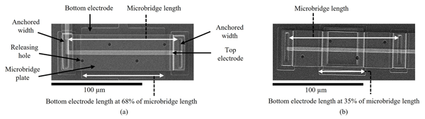 Development and analysis of microbridge resonators for reduced pull-in voltage and preserved resonant frequency